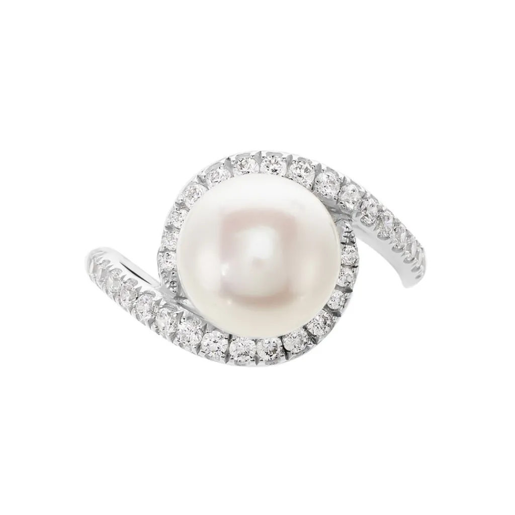 Bague Argent Blanc 925/1000 Pavage Oxydes De Zirconium Anneau Ovale Et Perle De Culture Sylvia