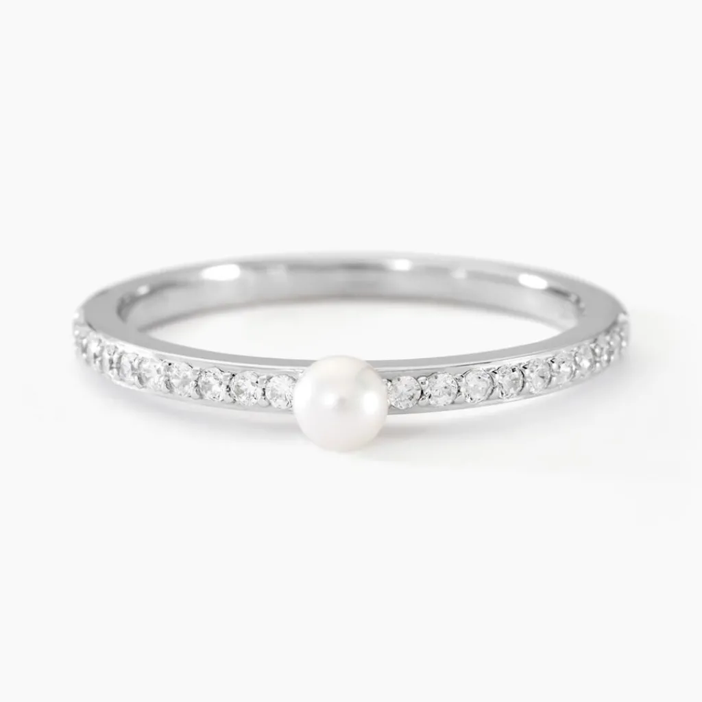 Bague Argent Blanc 925/1000 Perle De Culture Blanche Centrale Et Semi Pavage Oxydes De Zirconium