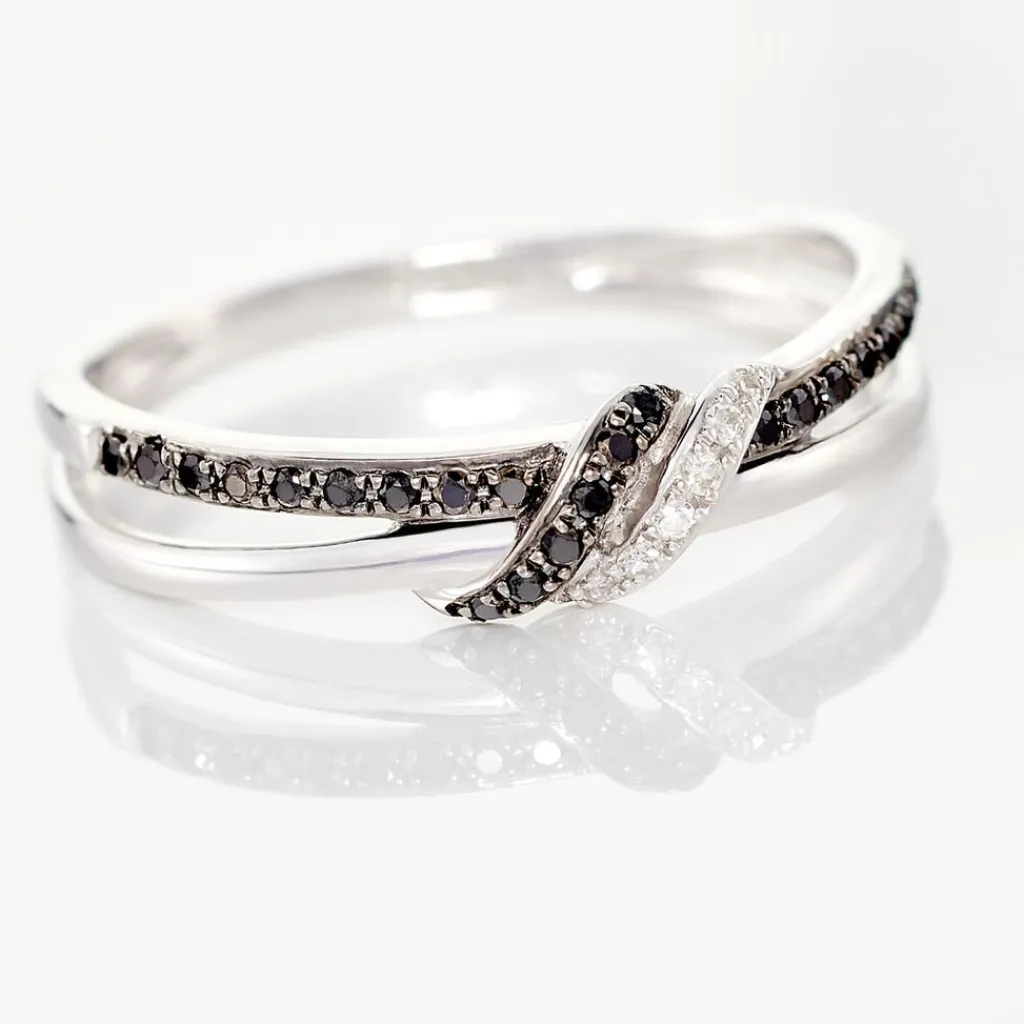 Bague Or Blanc 375/1000 Noeud Pave Diamants Blancs Diamants Noirs