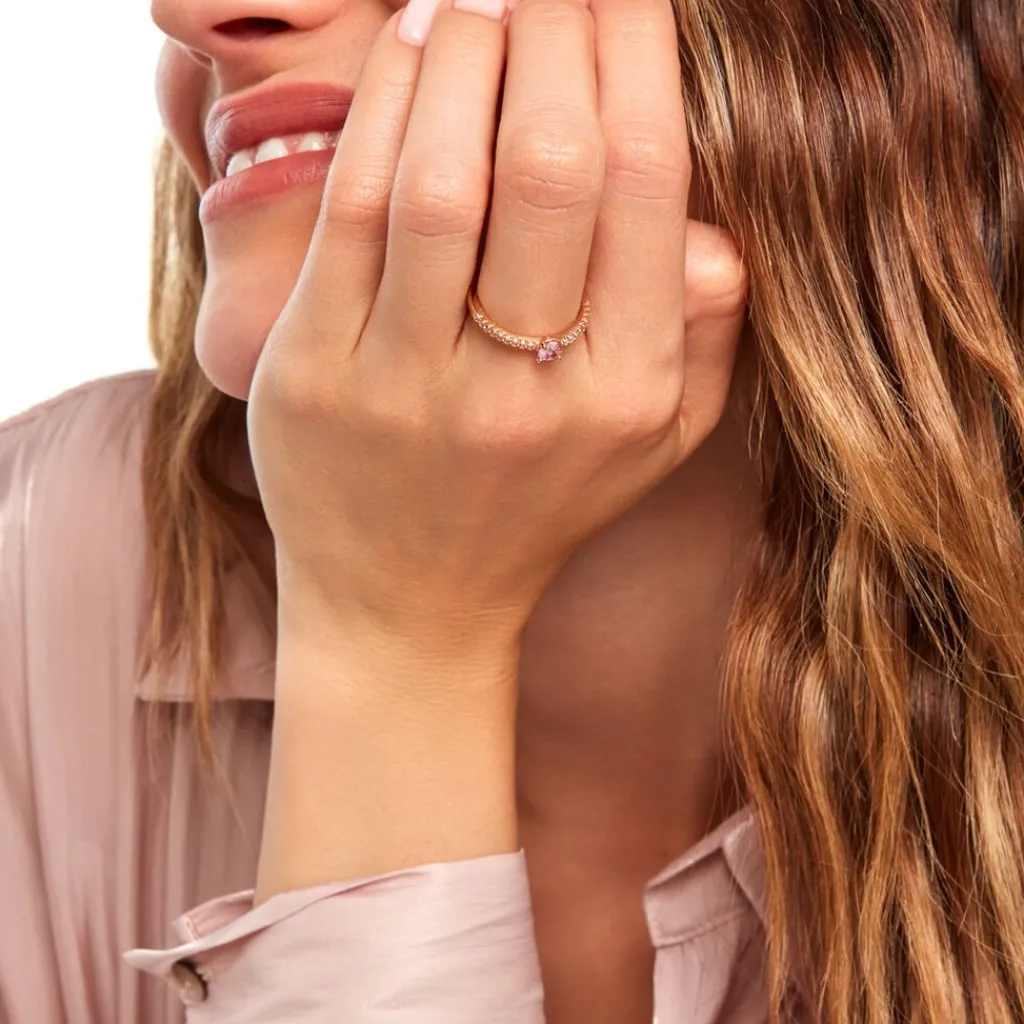 Bague Solitaire Plaqué Or Jaune Oxyde De Zirconium Rose Central Accompagné Oxydes De Zirconium