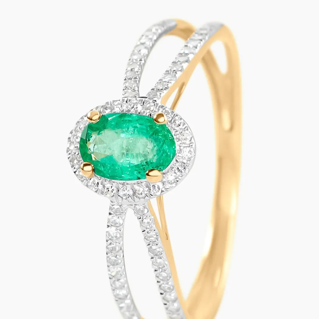 Bague Or Jaune 375/1000 Emeraude Ovale 0,36Cts Serti Griffes Entourage Diamants