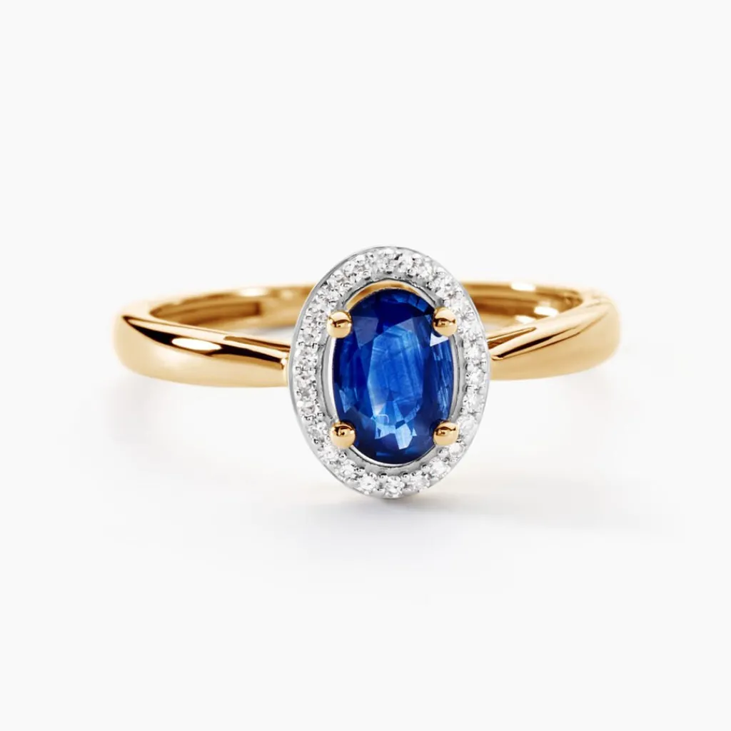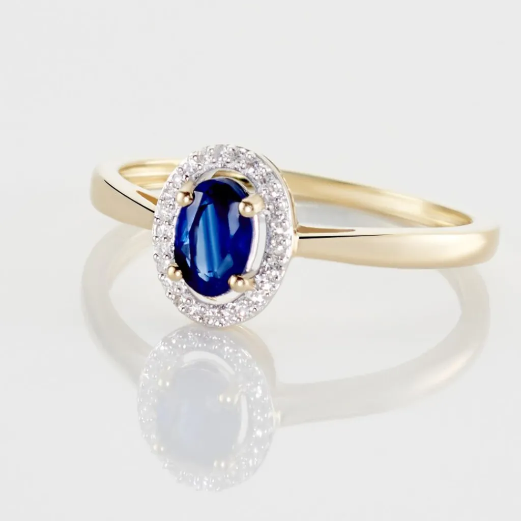Bague Or Jaune 375/1000 Saphir Ovale Entourage Diamants