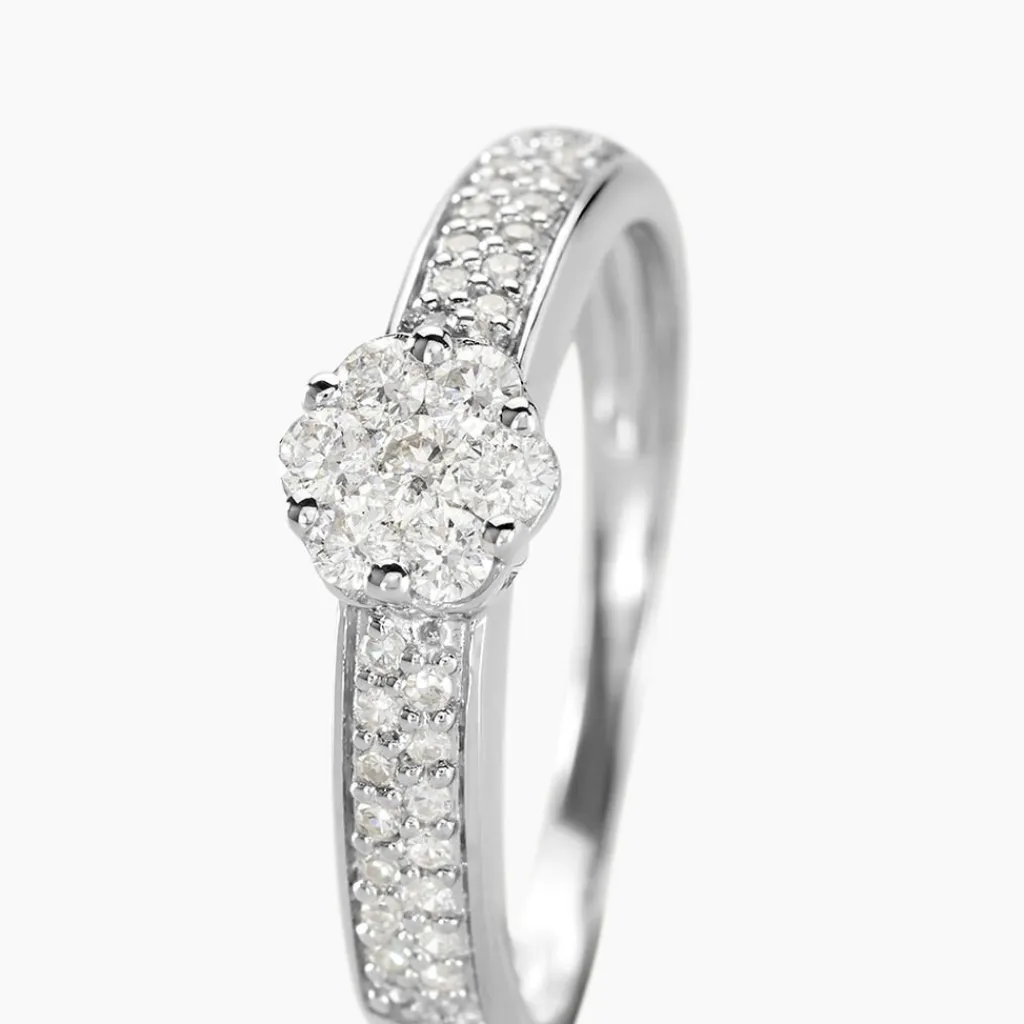 Bague Or Blanc 375/1000 Diamants Multi Pierre Effet Chou Central Corps De Bague Pave Diamants 0.25cts