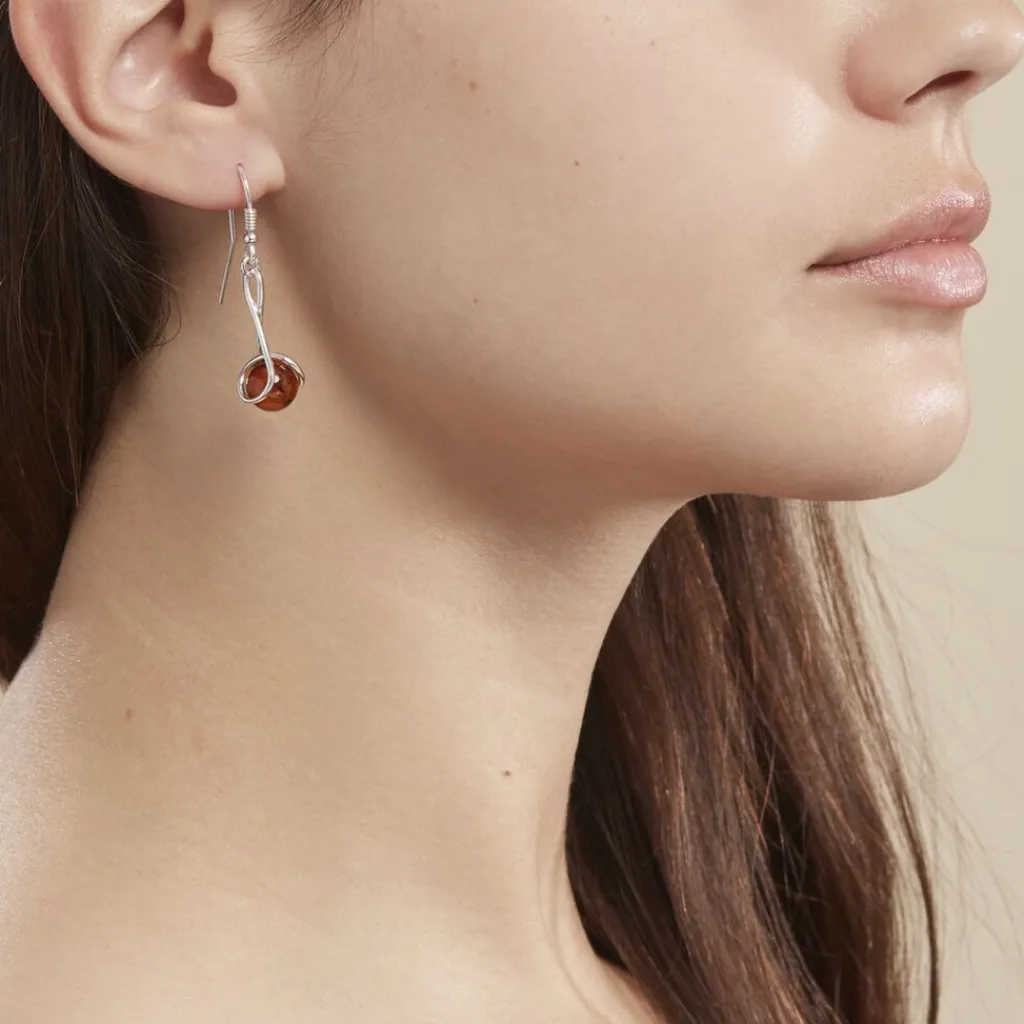 Boucles D’oreilles Pendantes Argent Blanc 925/1000 Ambre Forme Boule Ella