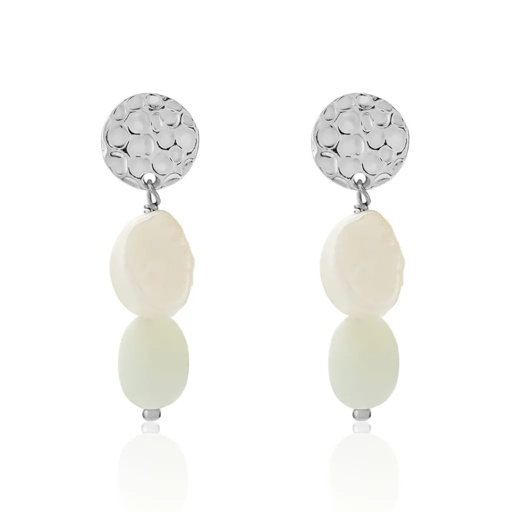 Boucles D’oreilles Pendantes Argent Blanc 925/1000 Pastilles Martelées Amazonites Vertes Et Perles De Culture