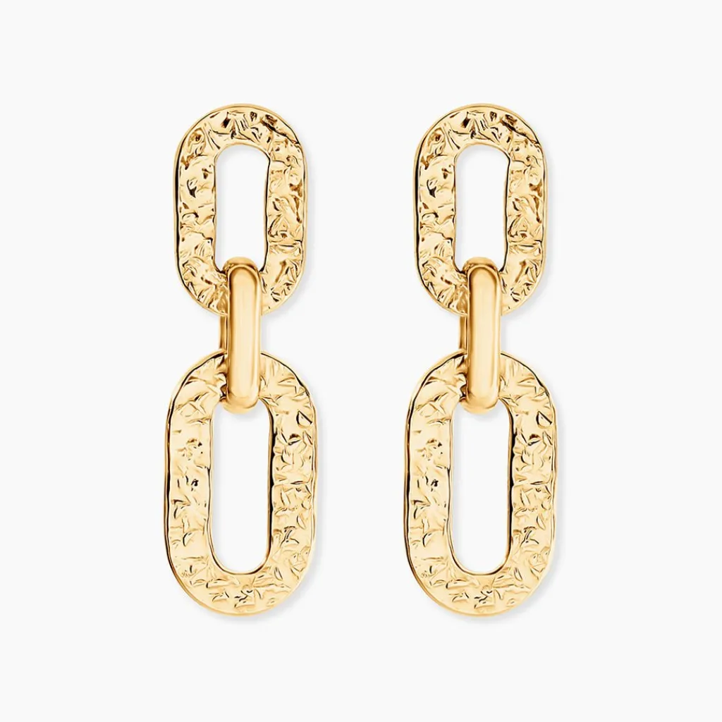 Boucles D’Oreilles Pendantes Or Jaune 375/1000 Maillons Rectangles Effet Martele
