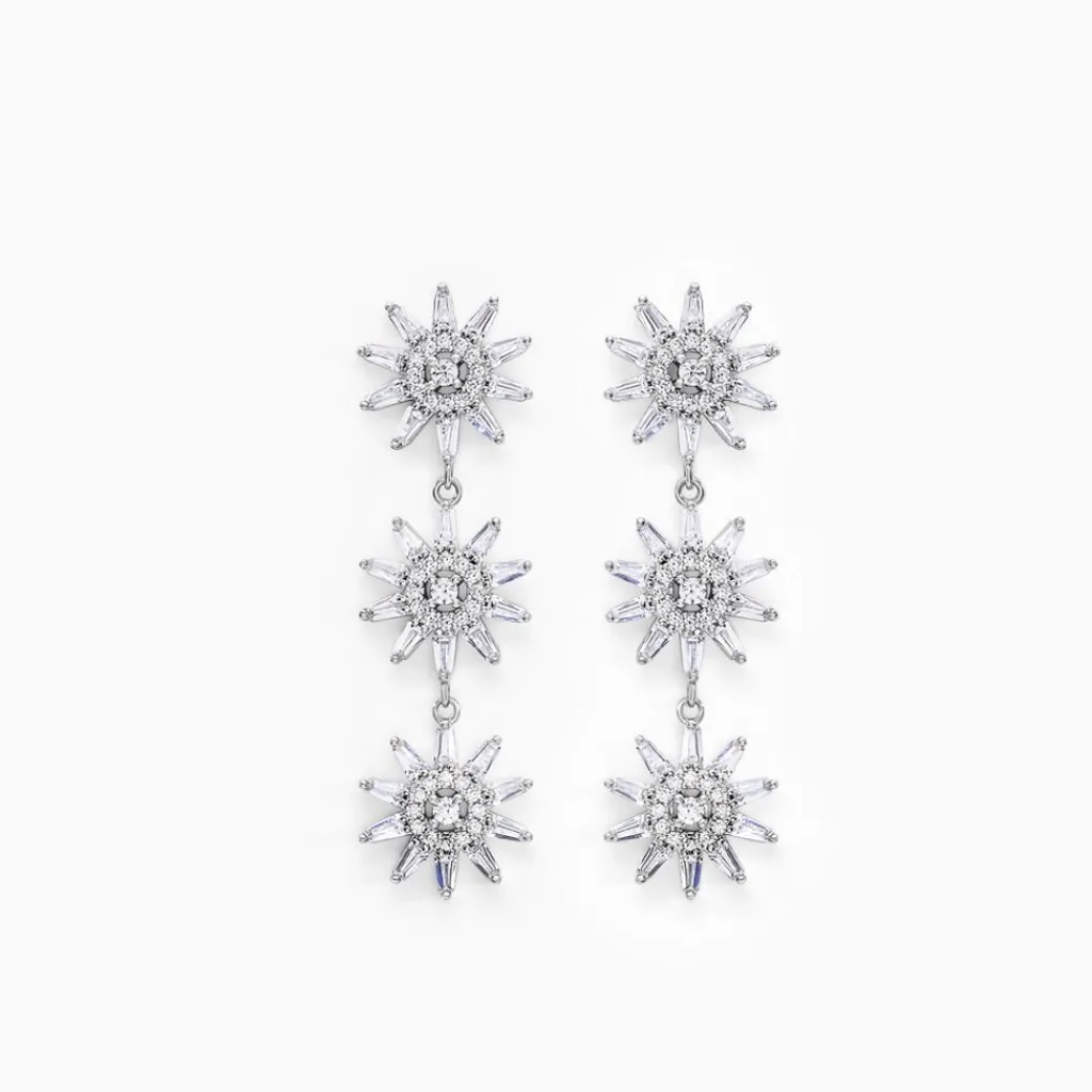 Boucles D’oreilles Dépareillées Argent Blanc 925/1000 Fleurs Pavage Oxydes De Zirconium