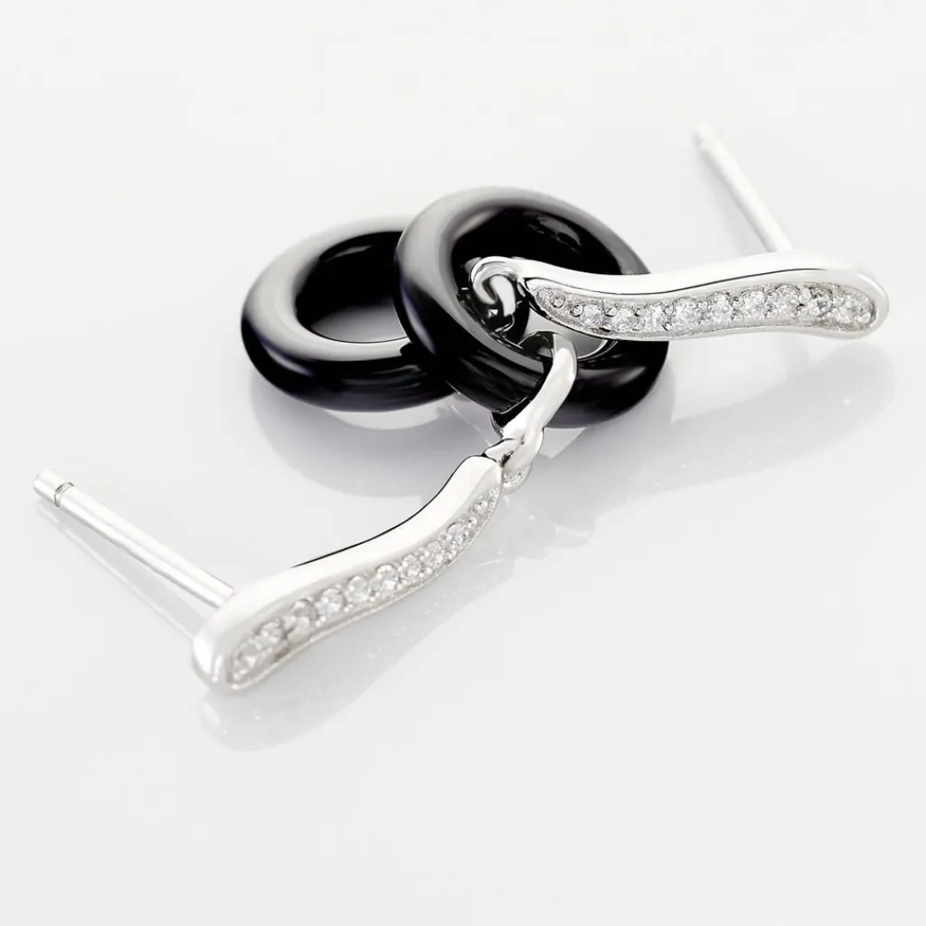 Boucles D’oreilles Pendantes Argent Blanc 925/1000 Mini Cercles Ceramique Noire Et Pavage Oxydes De Zirconium
