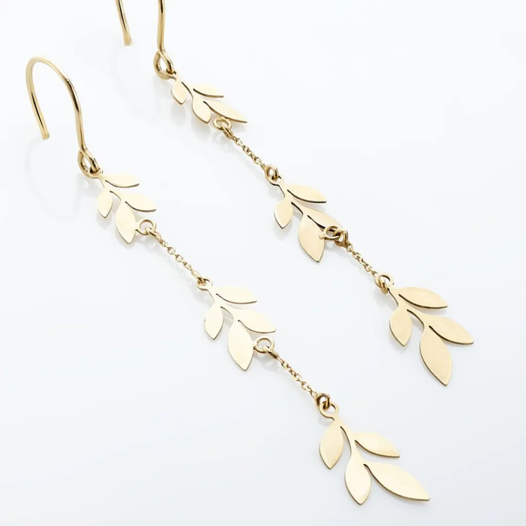 Boucles D’oreilles Or Jaune 375/1000 Pendantes Motif Feuille Chaine Maille Jaseron