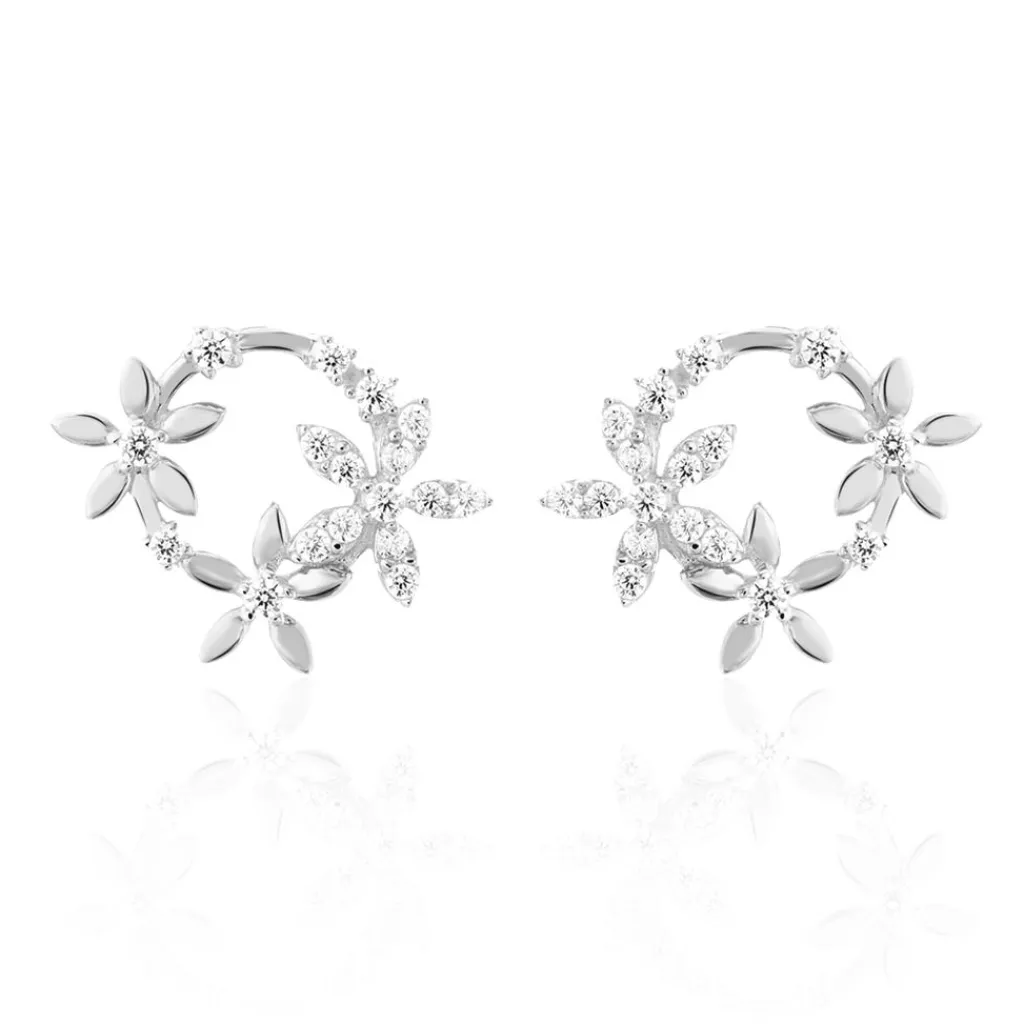 Boucles D’oreilles Argent Blanc 925/1000 Cercles Motifs Fleurs Semi Pavage Oxydes De Zirconium