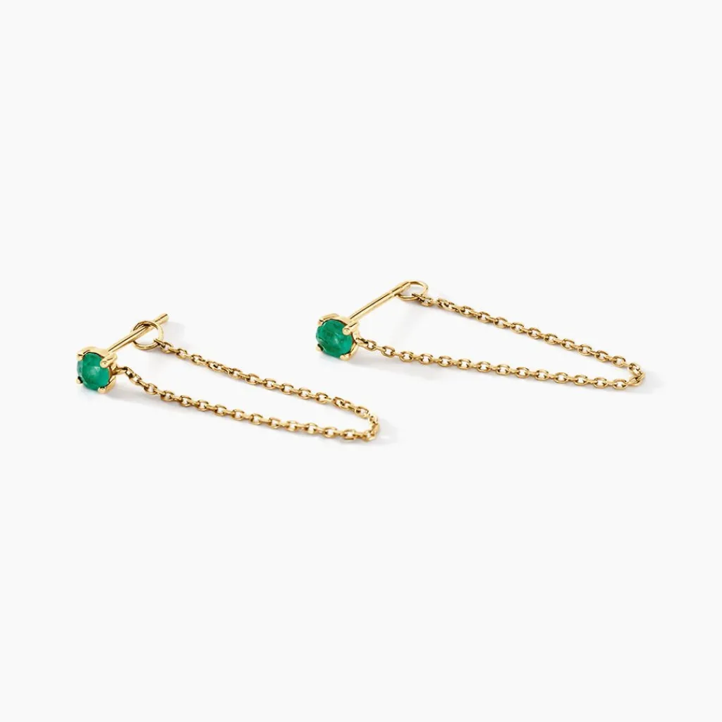 Boucles D’oreilles Pendantes Or Jaune 375/1000 Chaine Emeraude Ronde 0.22cts Serti Griffes