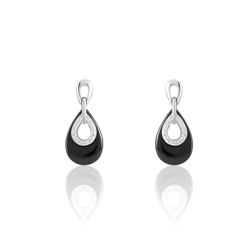 Boucles D’oreilles Argent Blanc 925/1000 Gouttes Ceramiques Noires Et Oxydes De Zirconium