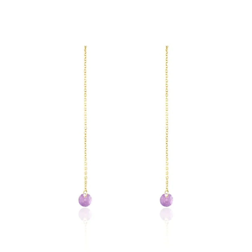 Boucles D’oreilles Pendantes Or Jaune 375/1000 Améthyste Ronde Percée