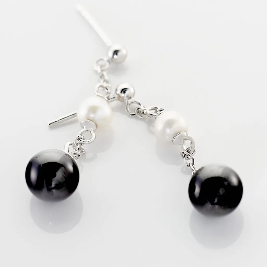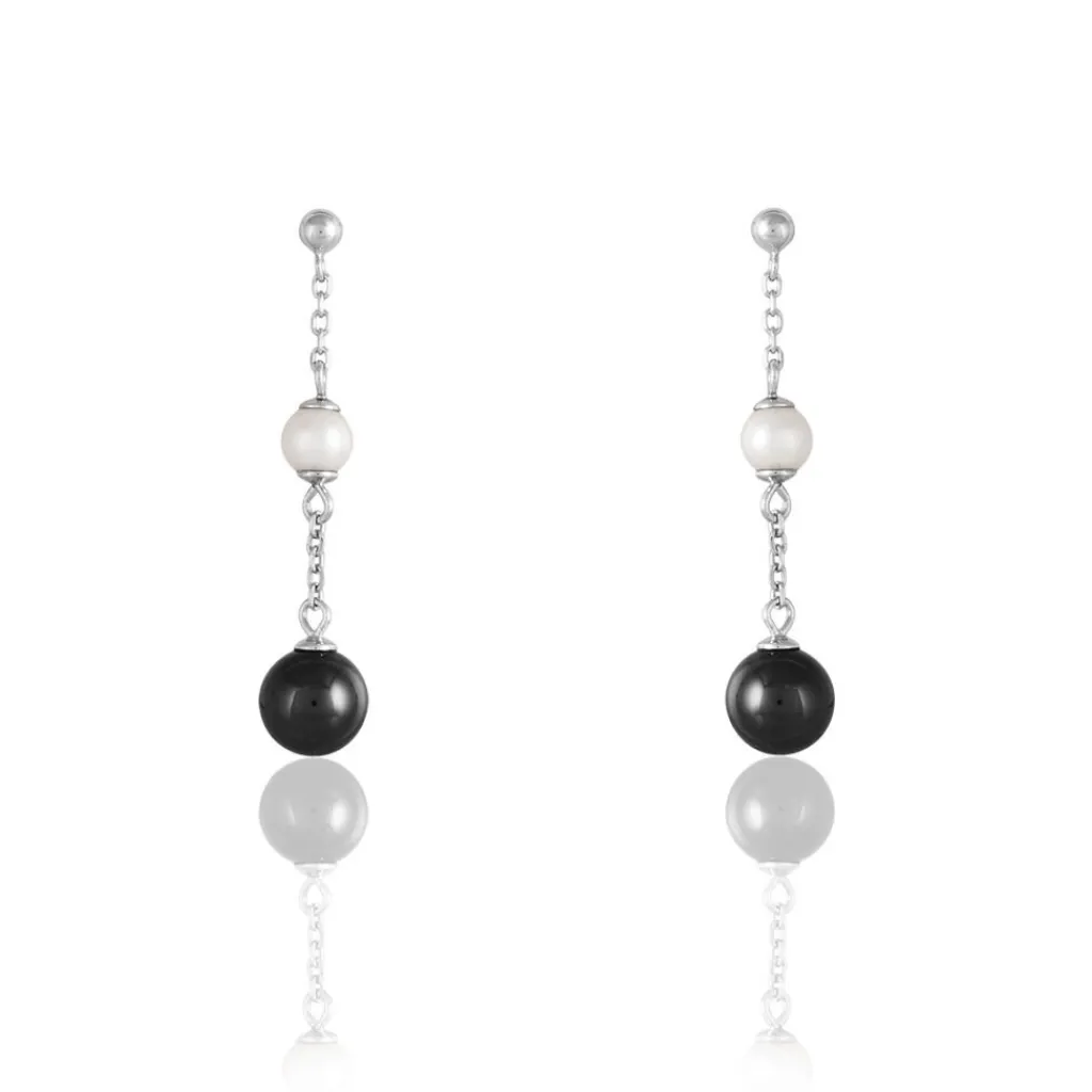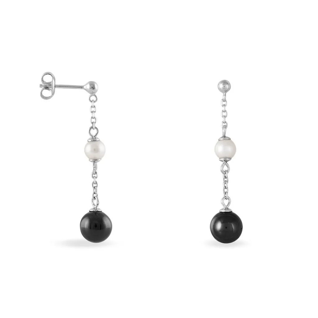 Boucles D’oreilles Pendantes Argent Blanc 925/1000 Mailles Forcats Perles De Culture Et Boules Ceramique Noire