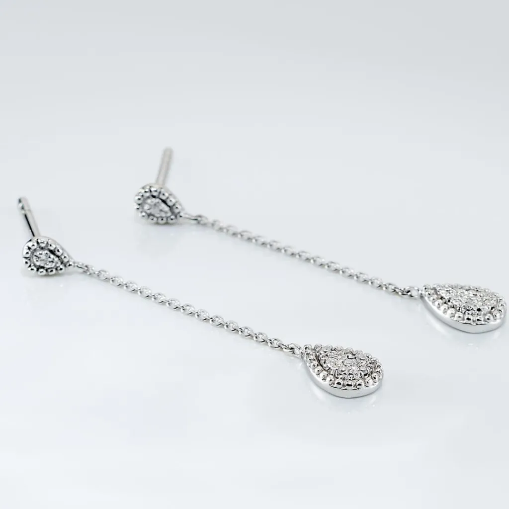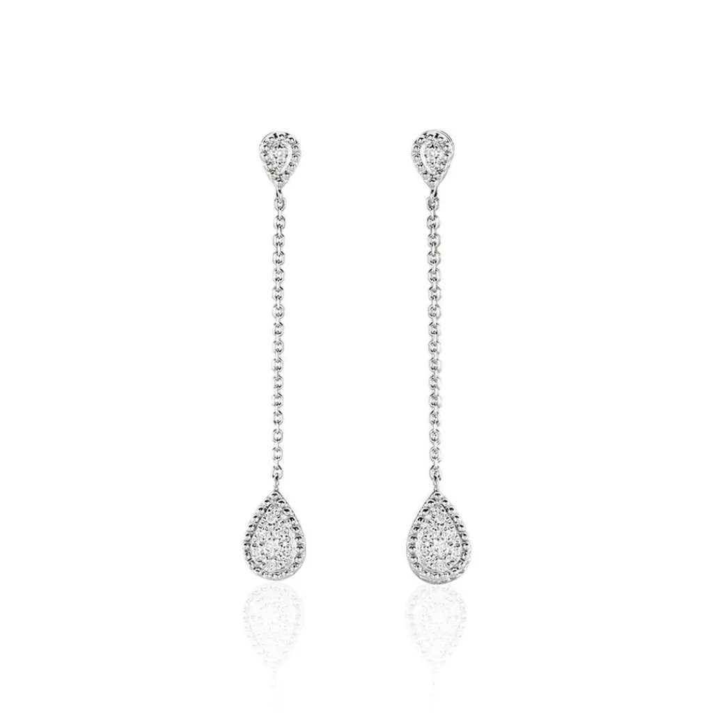 Boucles D’oreilles Or Blanc 375/1000 Pendantes Forme Goutte Pavage Diamants