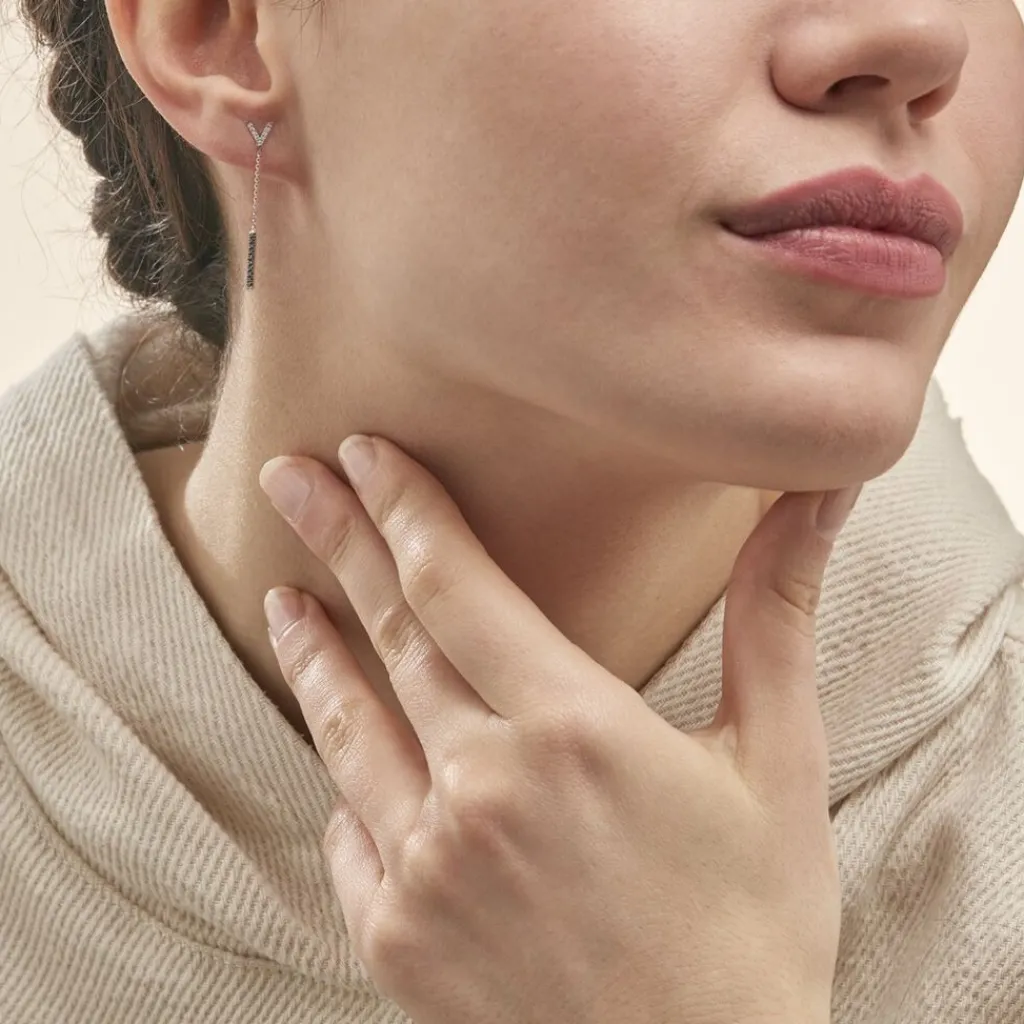 Boucles D’oreilles Or Blanc 375/1000 Formes V Pendantes Diamants Noirs Et Diamants Blancs
