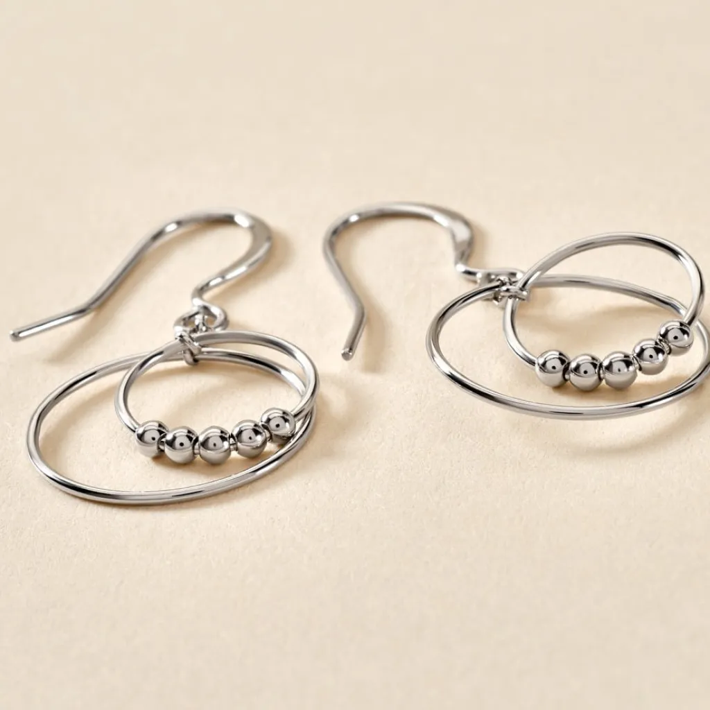 Boucles D’oreilles Pendantes Argent Blanc 925/1000 Double Cercles Et Boules Chaines Jaseron