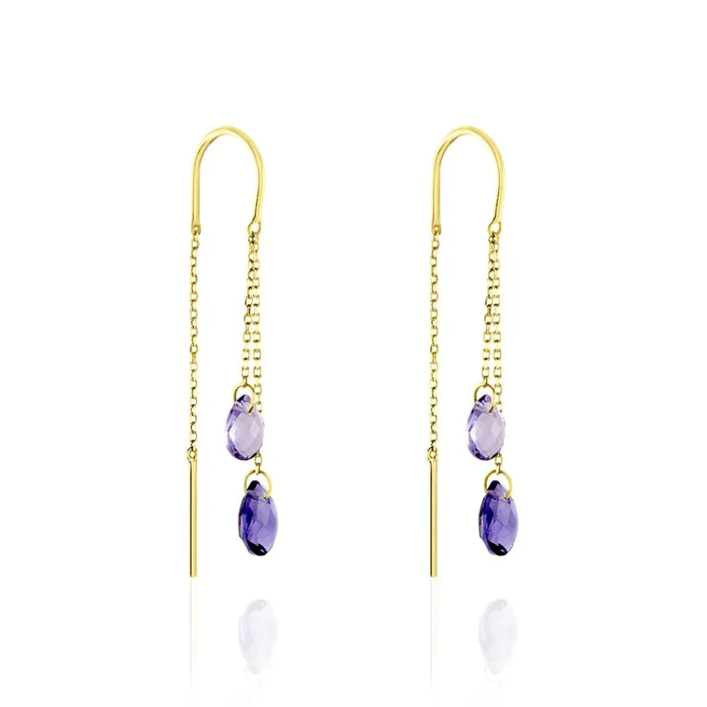 Boucles D’oreilles Pampilles Or Jaune 375/1000 Poire 2 Amethystes Parmes Percées Maille Omega