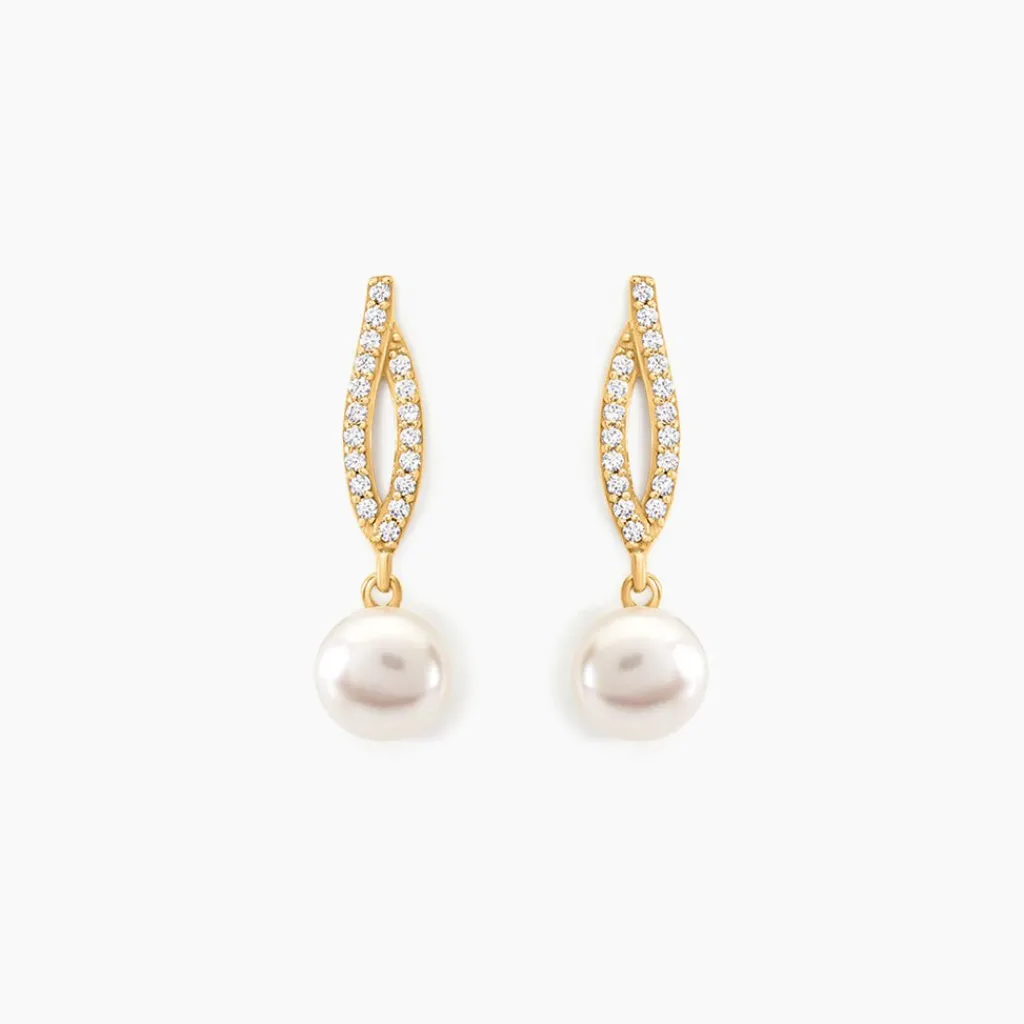 Boucles D’oreilles Or Jaune 375/1000 Forme Amandes Ajourées Oxydes De Zirconium Perles De Culture 6mm