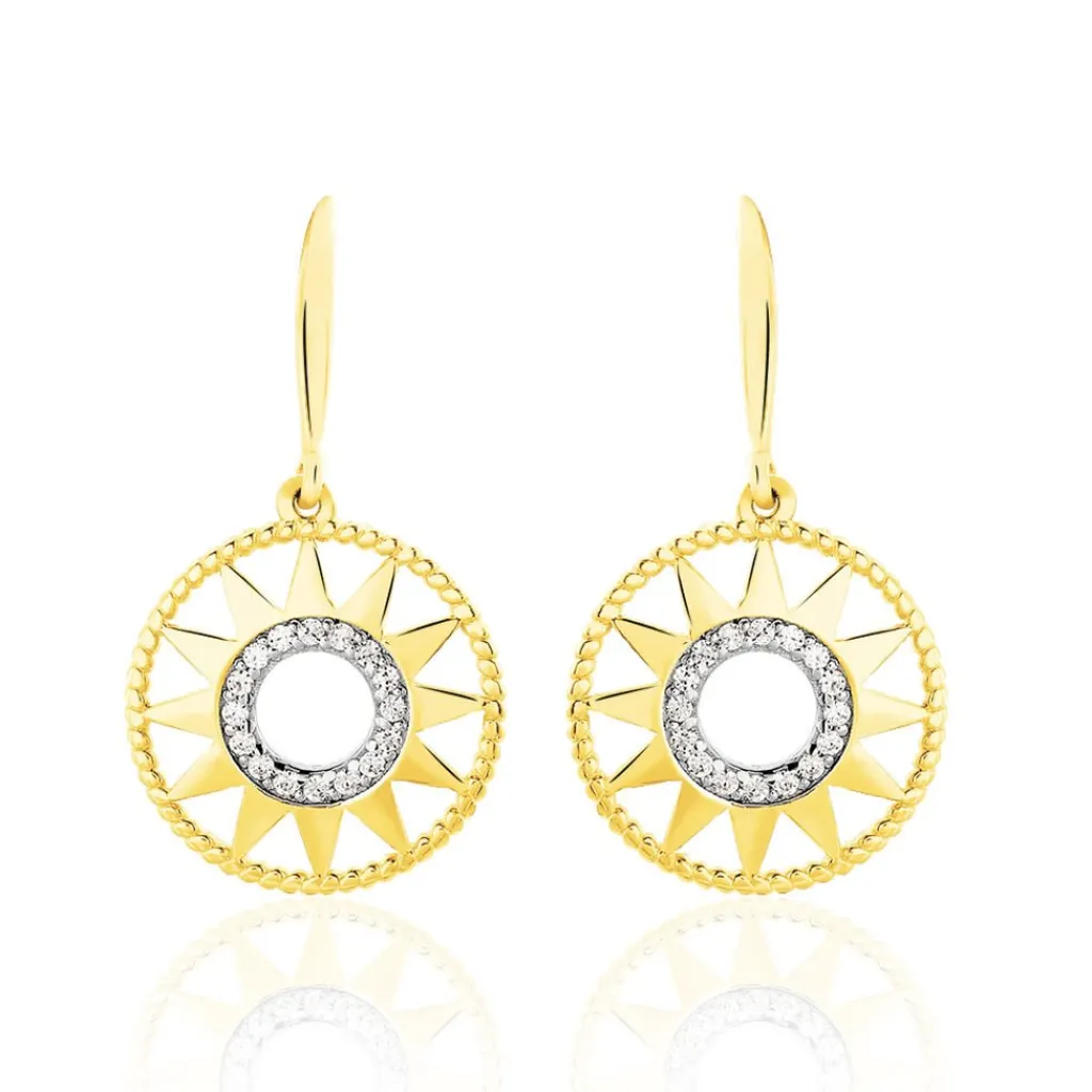 Boucles D’oreilles Or Jaune 375/1000 Pendantes Cercle Ajoure Et Motif Soleil Ajoure Pavage Oxyde De Zirconium