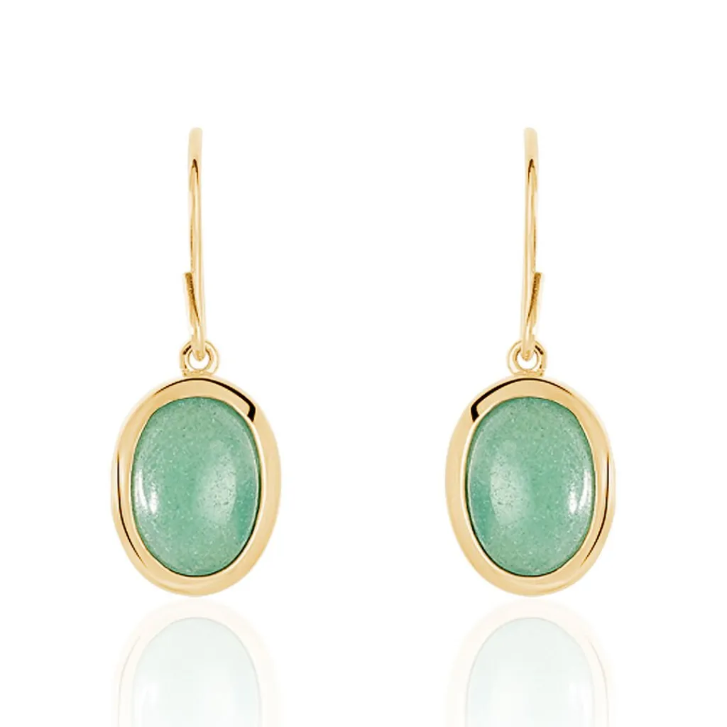 Boucles D’oreilles Pendantes Plaqué Or Jaune Avec Aventurines Ovales Vertes Serti Clos