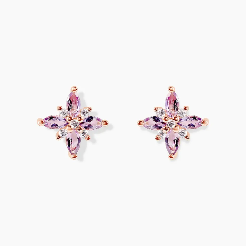 Boucles D’oreilles Puces Or Rose 375/1000 Motif Fleur Améthyste Violet Sertis Griffes Oxydes De Zirconium Blanc