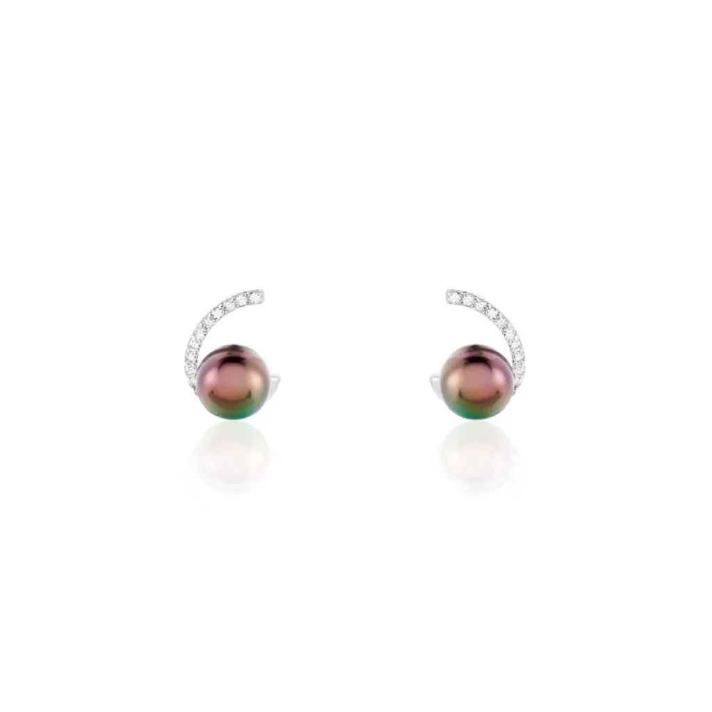 Boucles D’oreilles Or Blanc 375/1000 Perle De Culture Nacre Noire 6mm Oxydes De Zirconium