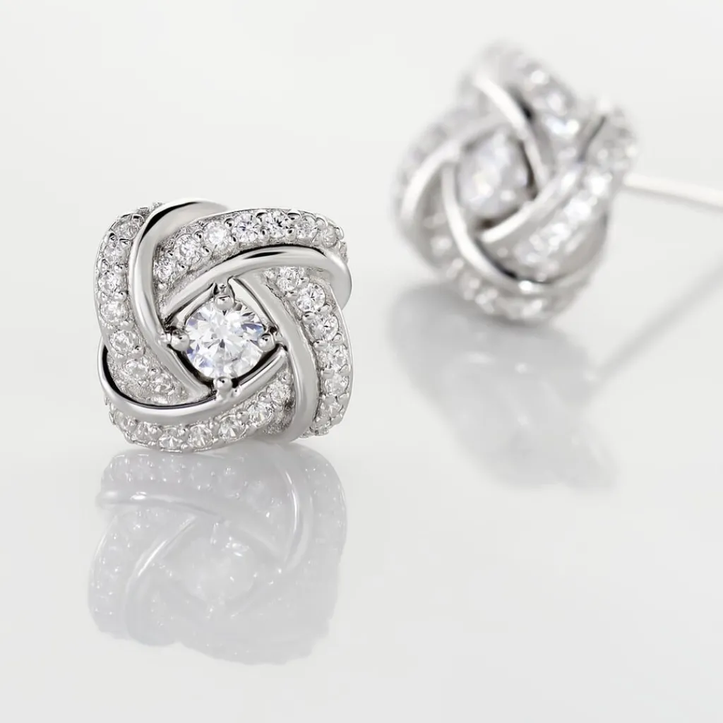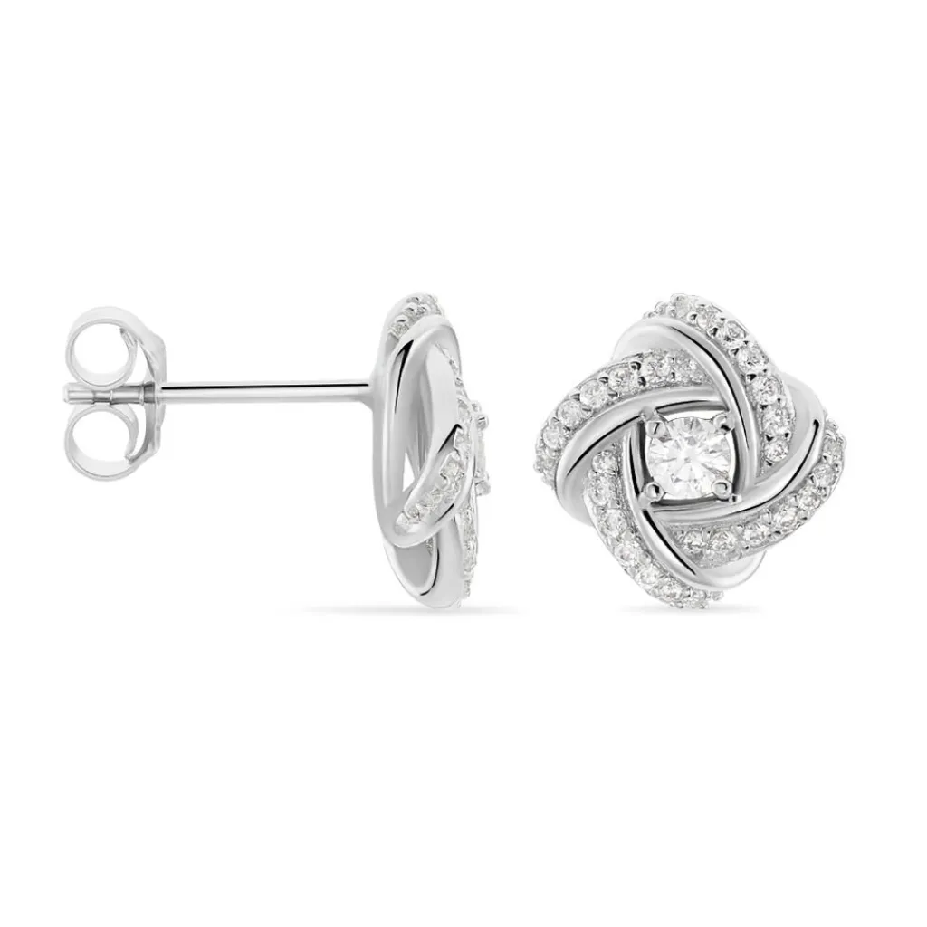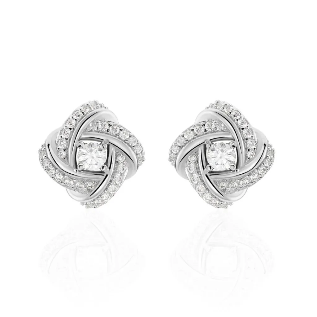 Boucles D’oreilles Puces Argent Blanc 925/1000 Nids Sertis Griffes Et Pavage Oxydes De Zirconium
