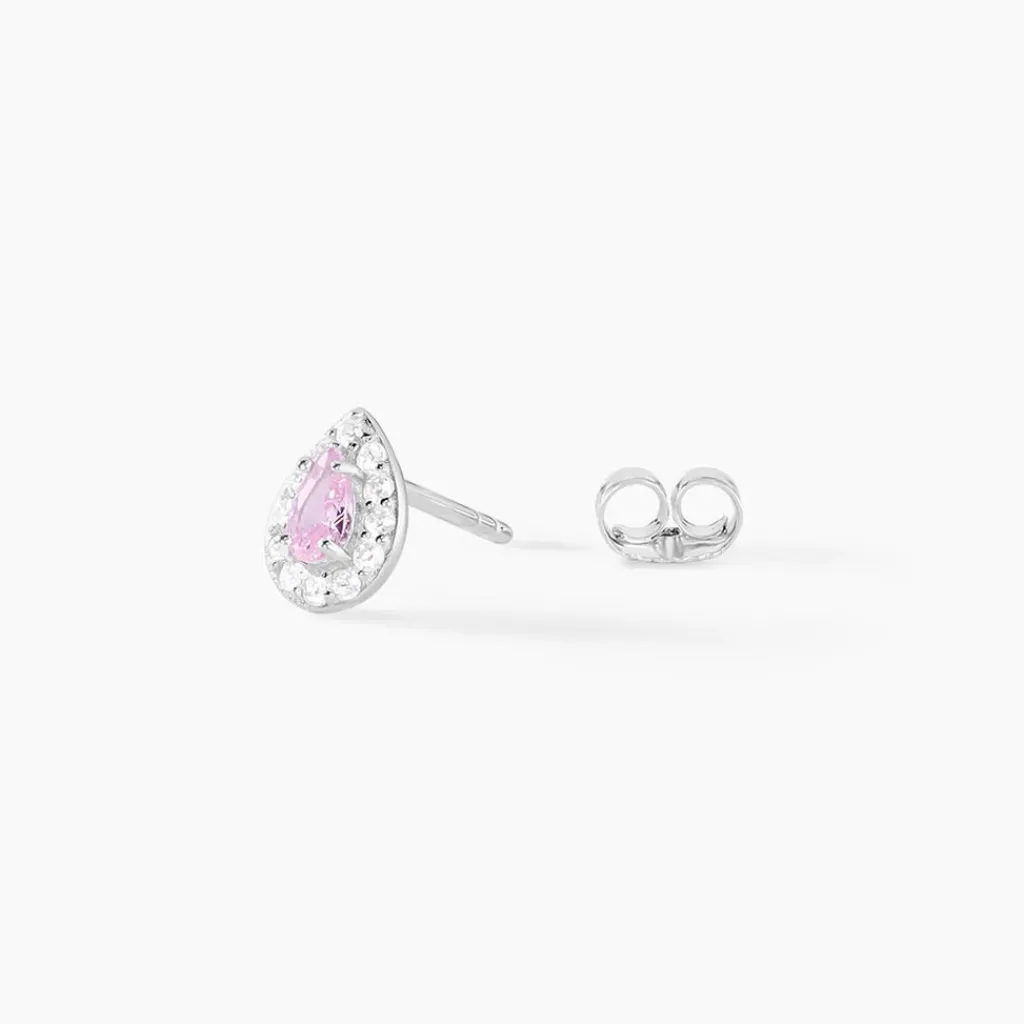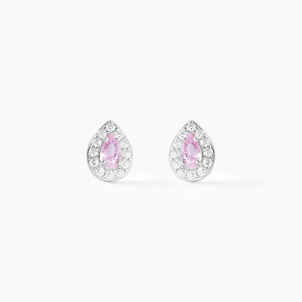 Boucles D’oreilles Puces Argent Blanc 925/1000 Gouttes Roses Entourage Sertis Griffes Oxydes De Zirconium
