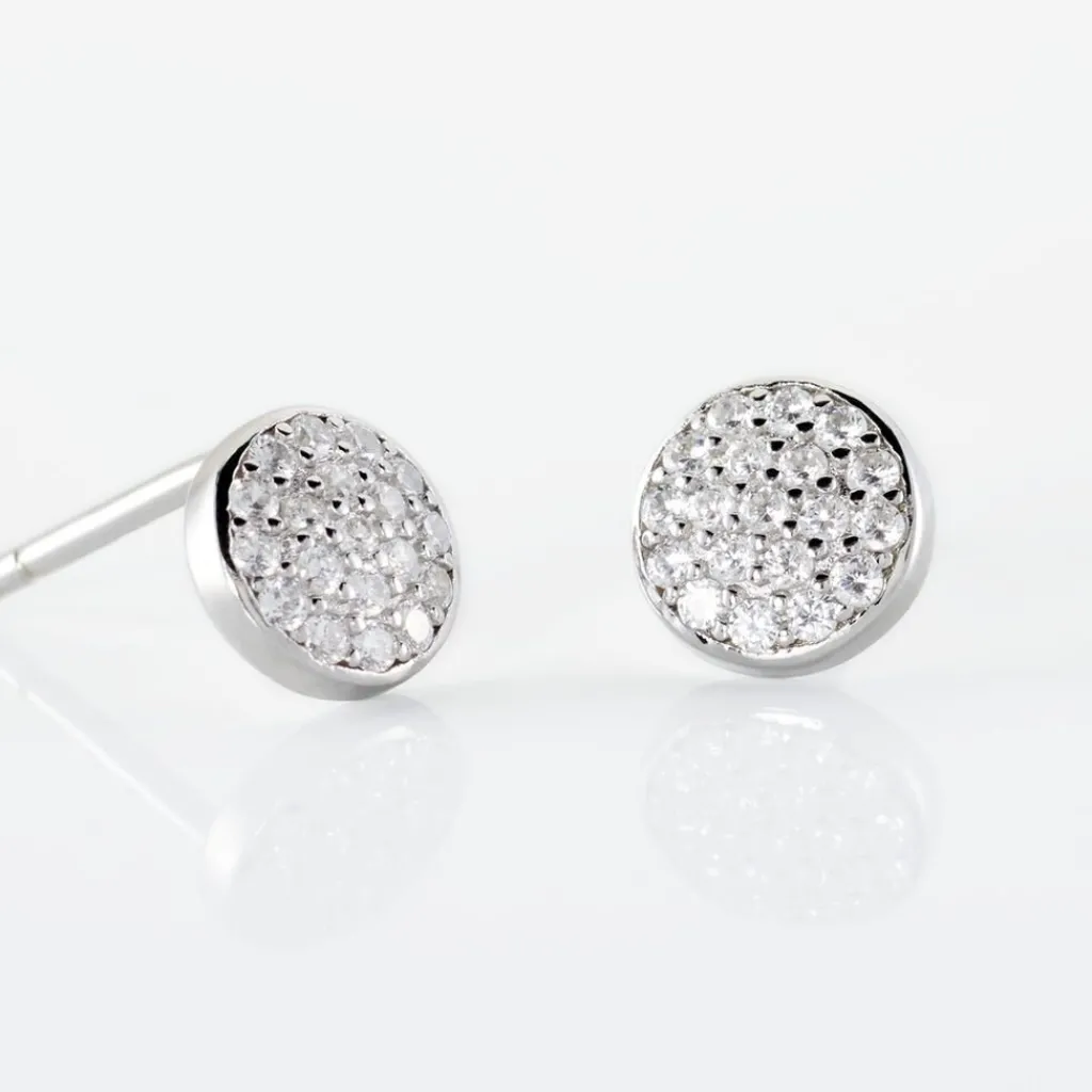 Boucles D’oreilles Puces Argent Blanc 925/1000 Pastilles Pavage Oxydes De Zirconium
