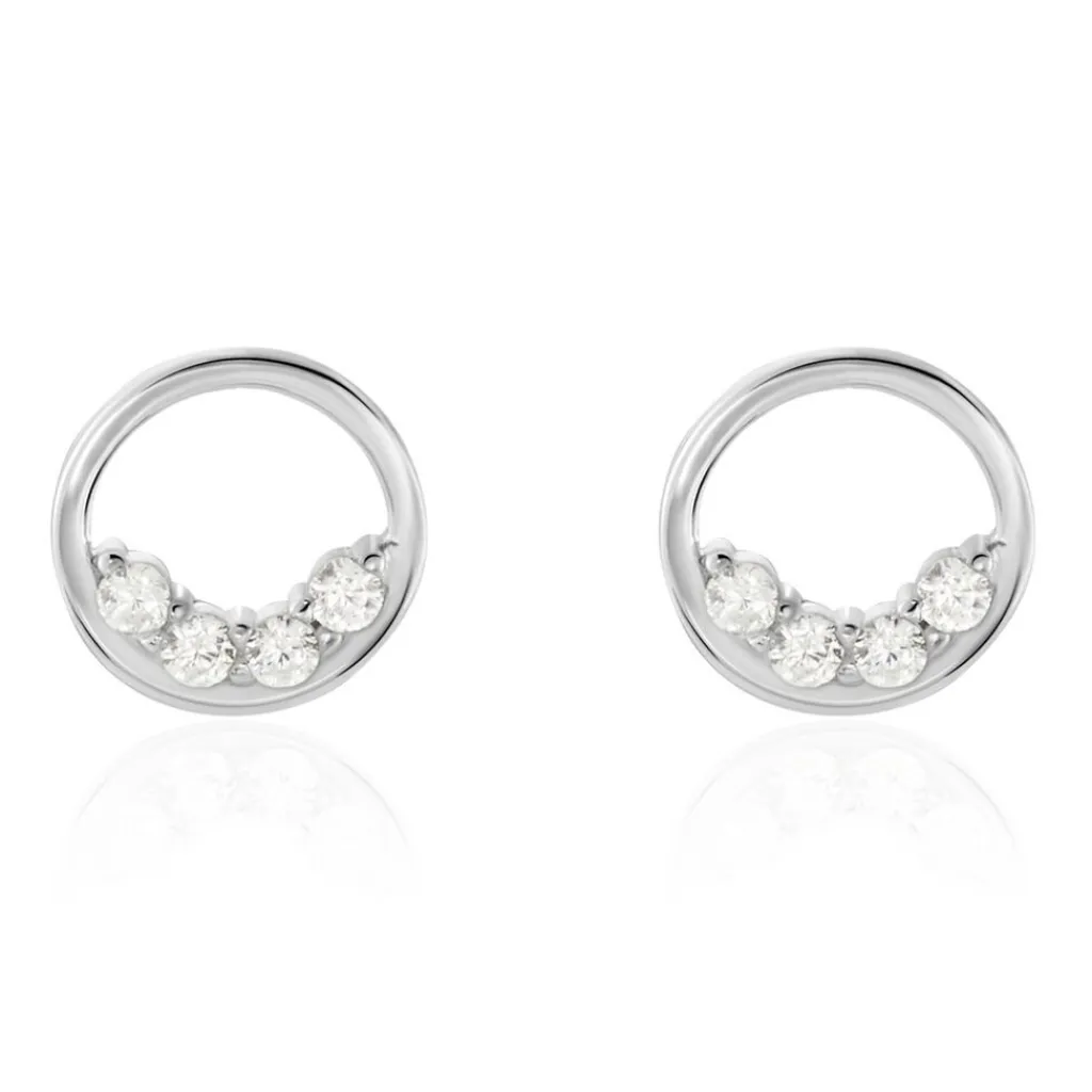 Boucles D’oreilles Puces Argent Blanc 925/1000 Cercles Sertis Griffes 3 Oxydes De Zirconium