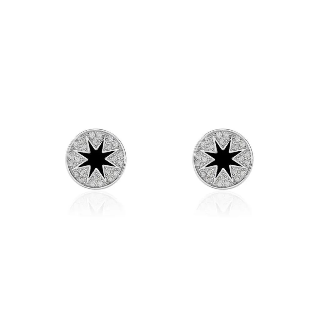 Boucles D’oreilles Puces Argent Blanc 925/1000 Pastilles Etoile Laque Noire Pavage Oxydes De Zirconium