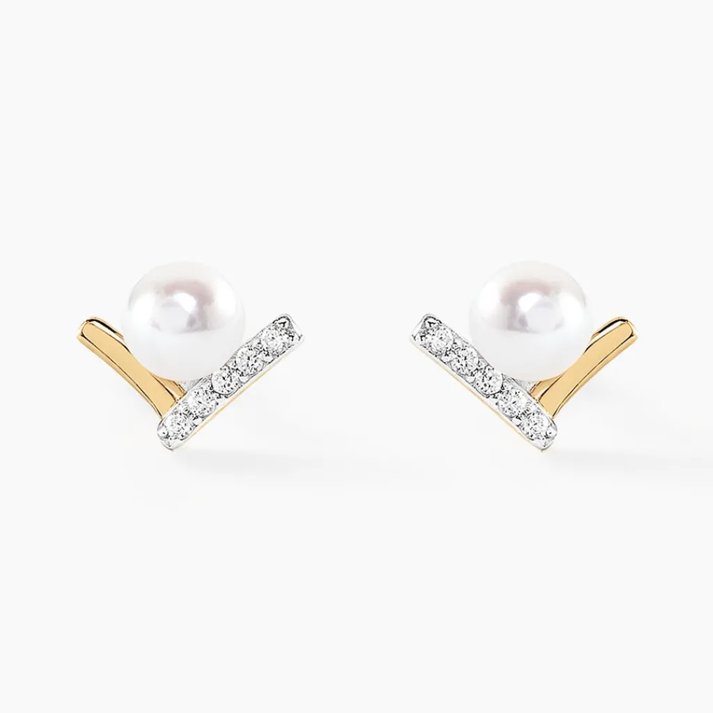 Boucles D’oreilles Puces Or Jaune 375/1000 Perles De Culture Blanches Bouton 4mm