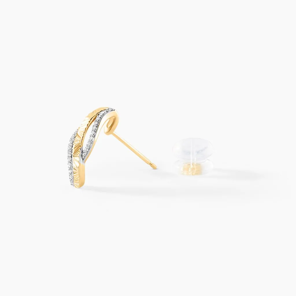 Boucles D’oreilles Or Jaune 375/1000 Puces Forme Vague Effet Diamante Pavage Diamants