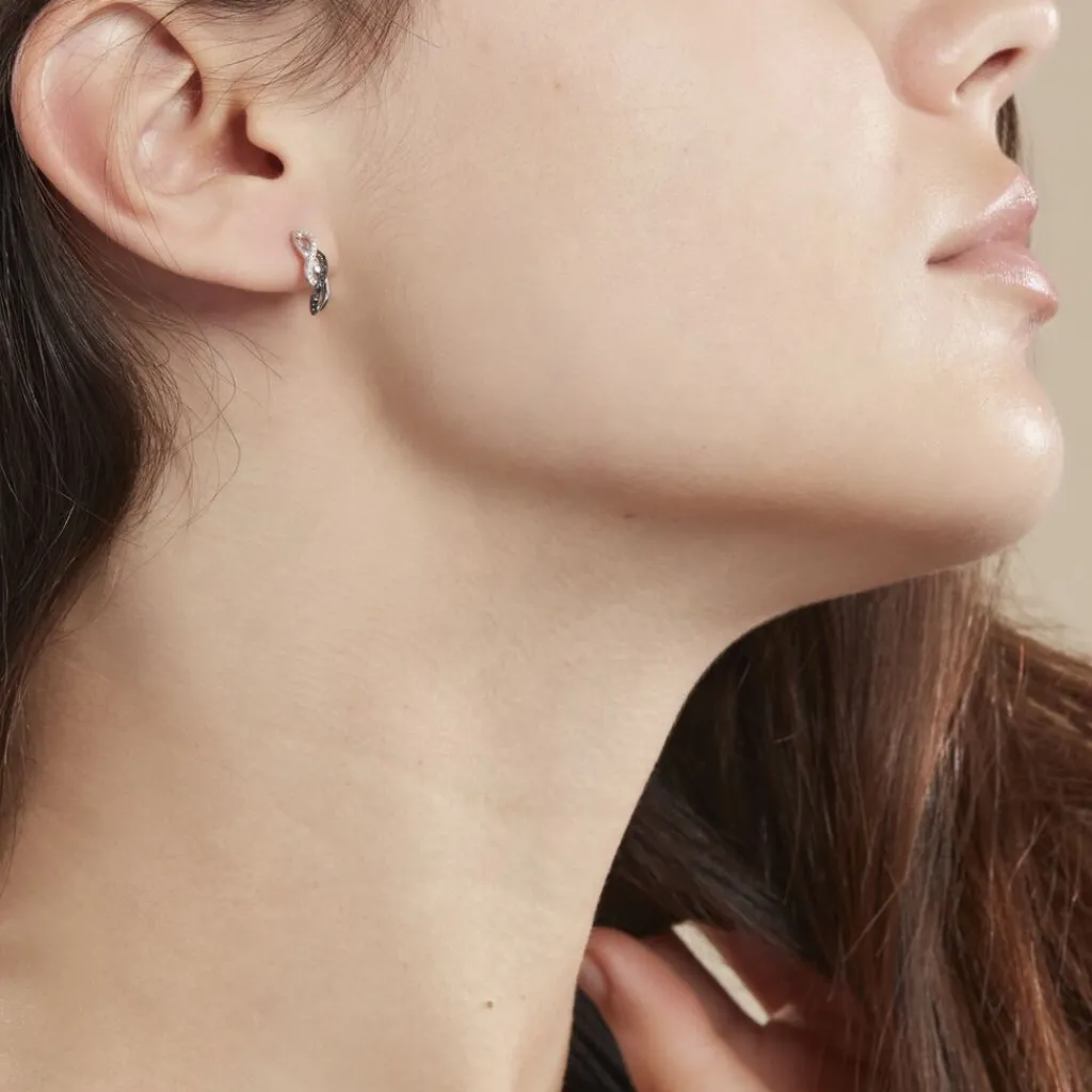 Boucles D’oreilles Or Blanc 375/1000 Forme Vague Double Diamants Blancs Et Noirs