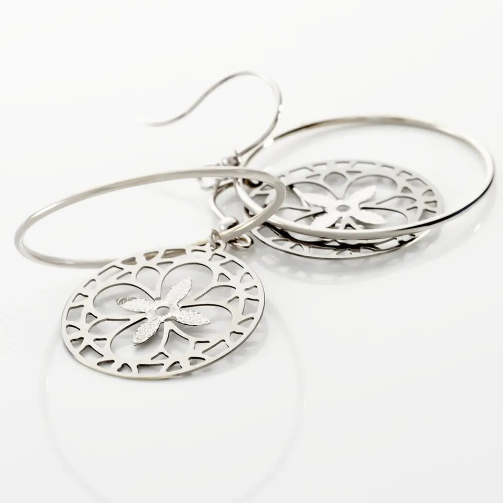 Boucles D’oreilles Pendantes Or Blanc 375/1000 Double Cercles Avec Motif Trefles Ajoures