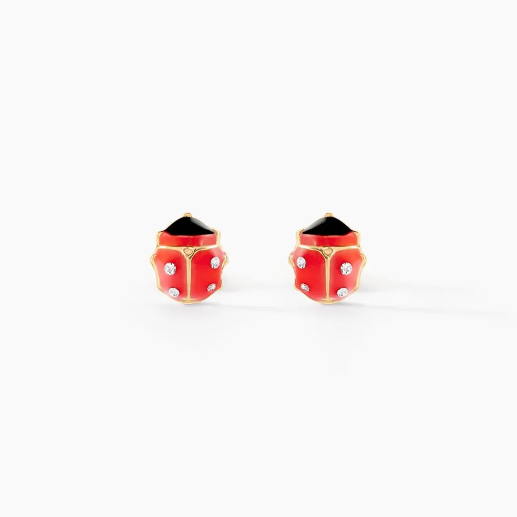 Boucles D’oreilles Puces Or Jaune 750/1000 Coccinelles Email Rouge Oxydes De Zirconium Fermoir A Vis