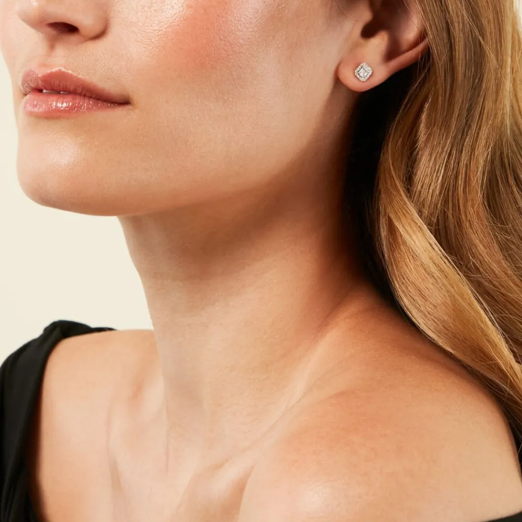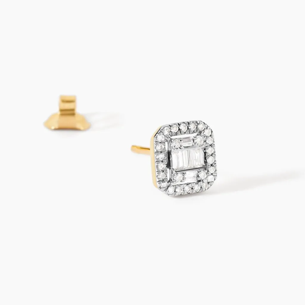 Boucles D’Oreilles Puces Or Jaune 375/1000 Carree Diamants Baguettes 0,19Cts