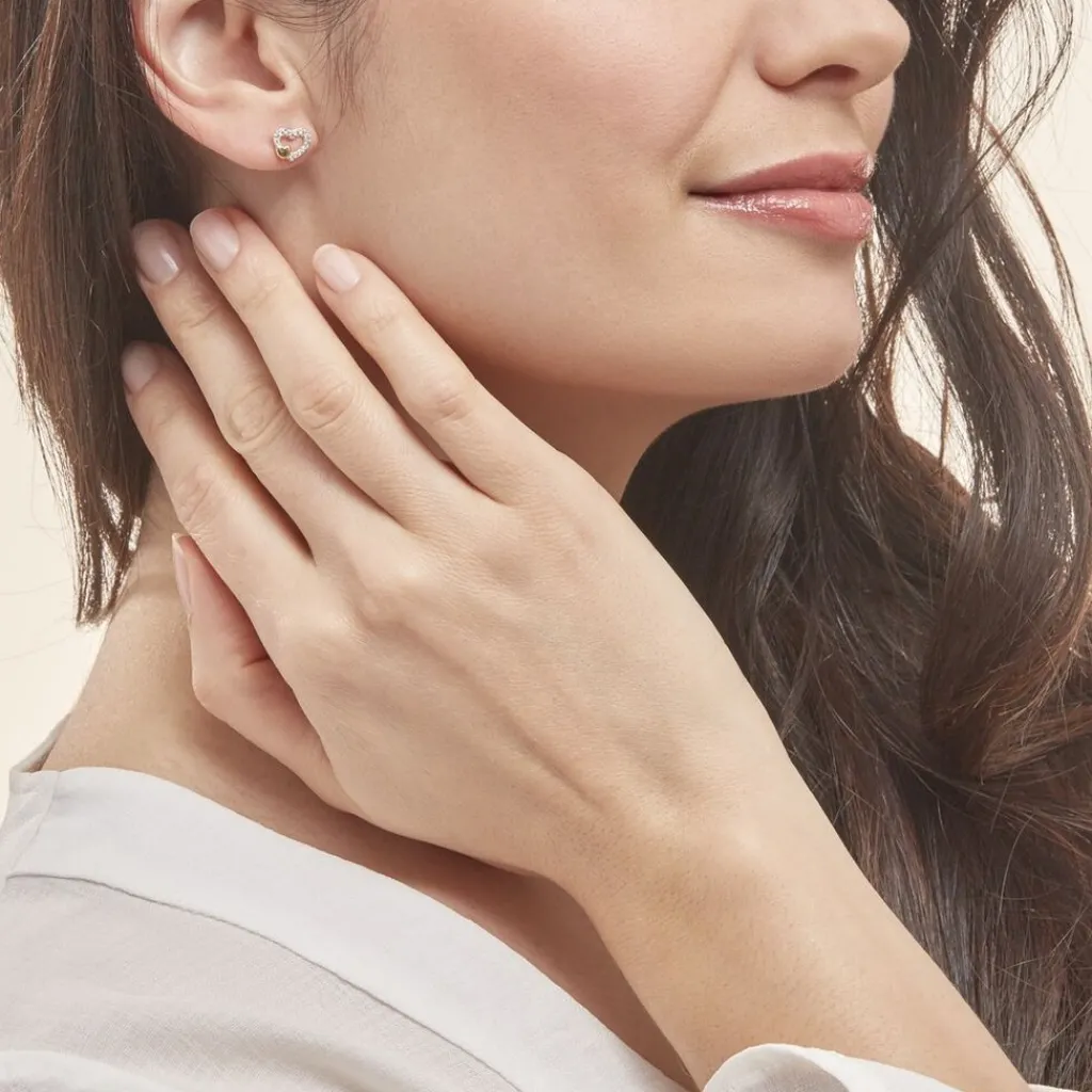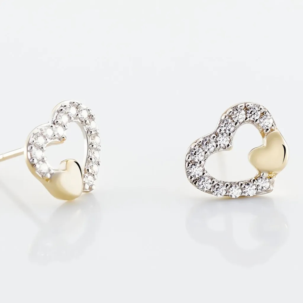 Boucles D’oreilles Or Jaune 375/1000 Puces Motifs C艙urs Paves Oxydes De Zirconium + Motif C艙ur Plein