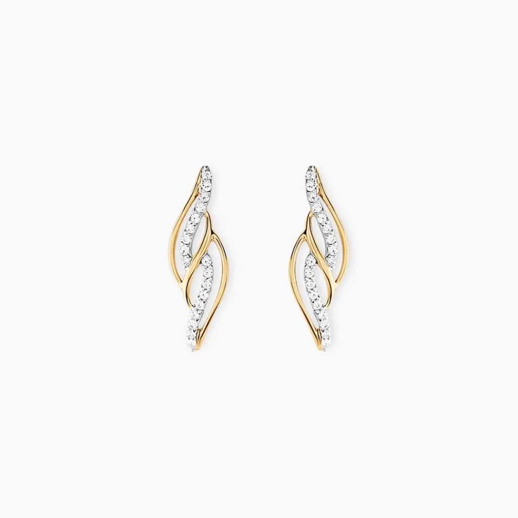 Bo Puces Or Jaune 750/1000 Vague Oxyde De Zirconium Blanc Serti Pavage