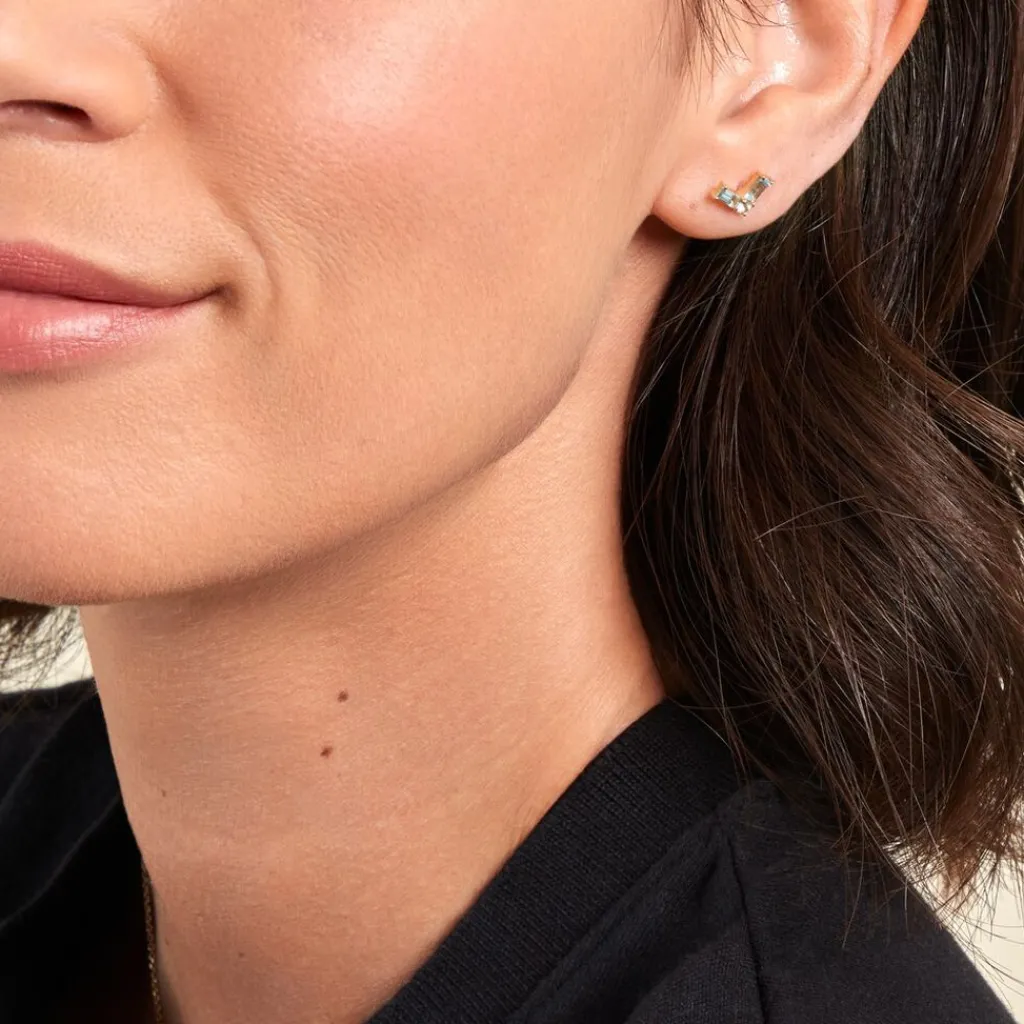 Boucles D’oreilles Puces Baguette Or Jaune 375/1000 Topaze Bleu Sky Serti 4 Griffes