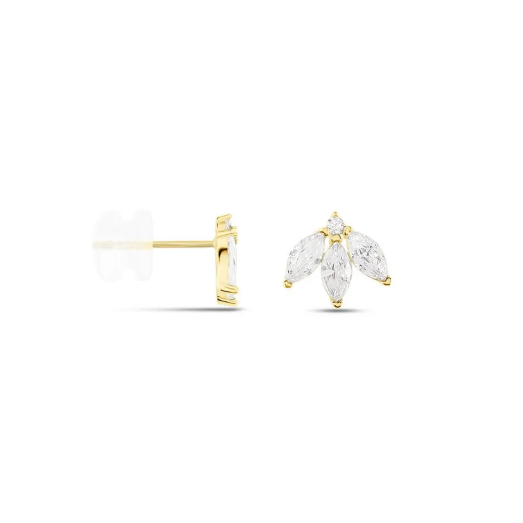 Boucles D’oreilles Puces Or Jaune 375/1000 Fleur Oxydes De Zirconium Navette Et Rond Serti Griffes