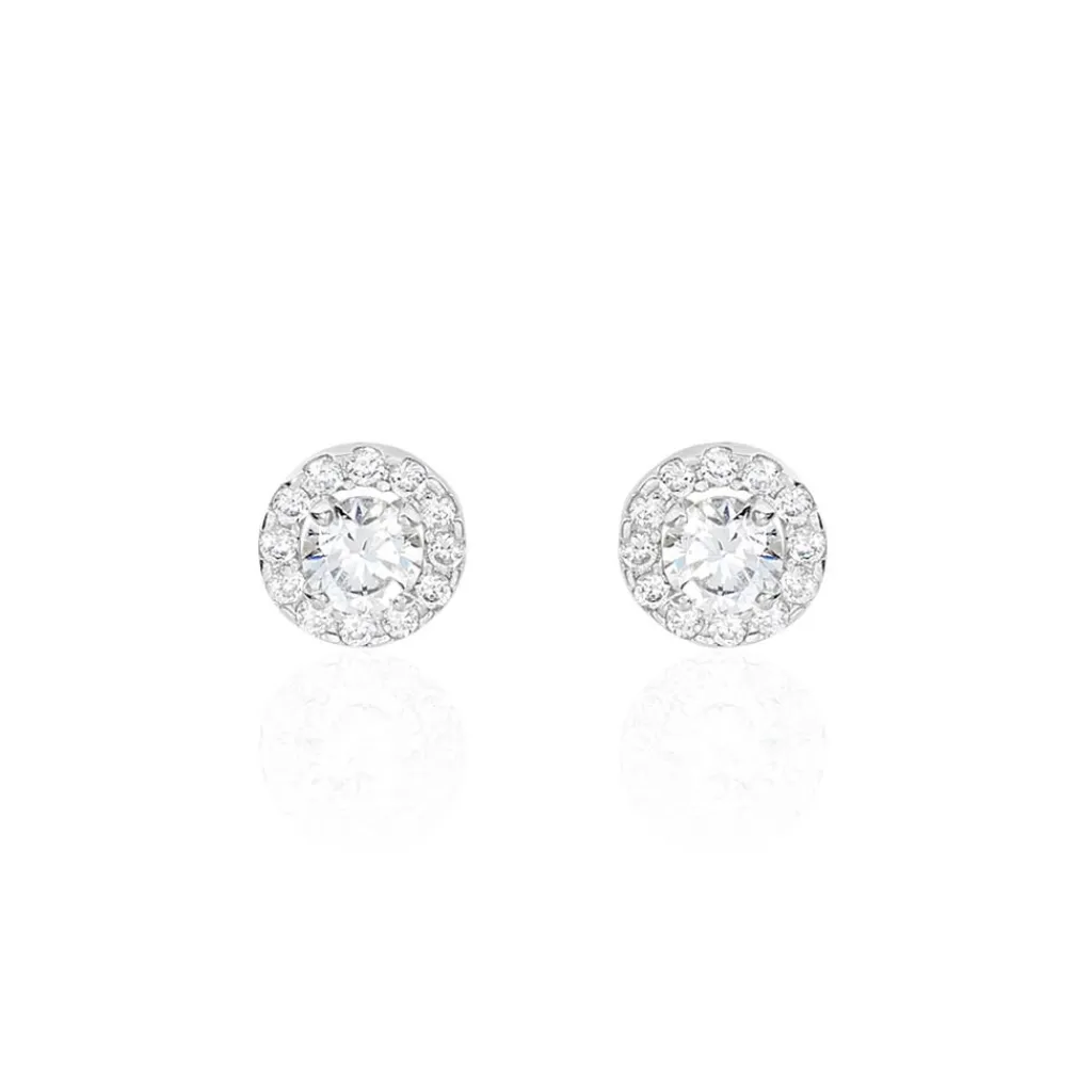 Boucles D’oreilles Or Blanc 375/1000 Puces Entourages Oxydes De Zirconium