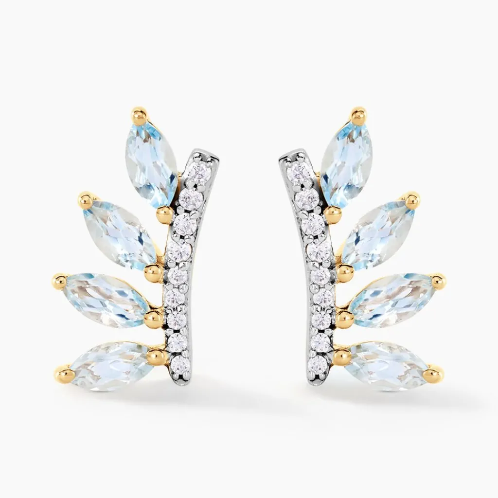 Boucles D’oreilles Puces Or Jaune 375/1000 Petales Topaze Bleu Sky Navette 0.72cts Pavage Oxyde De Zirconium