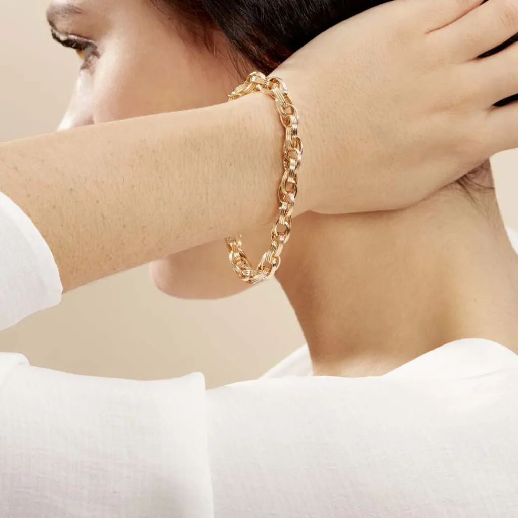 Bracelet Or Jaune 375/1000 Maillons Ovales Fil Plat Lisses Et Diamantes 8.3mm 19cm