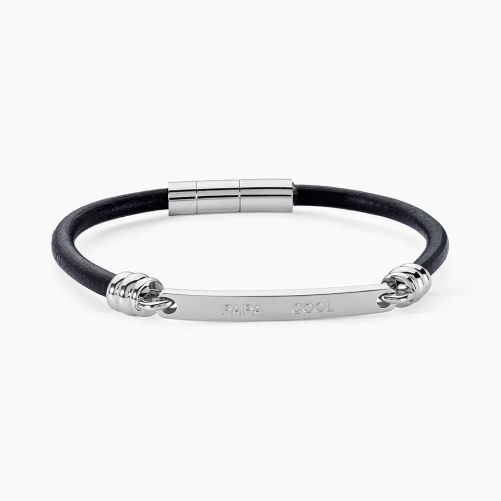 Bracelet Acier Inoxydable Blanc Cuir De Vache Noir Message Papa Cool 21cm