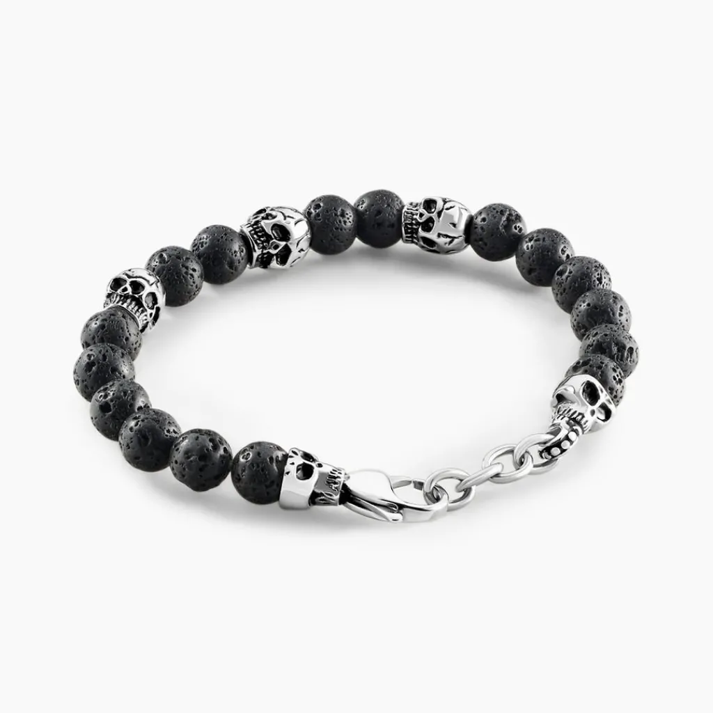 Bracelet Acier Inoxydable Blanc Boules Pierre De Lave 8mm Et Têtes De Morts 21cm