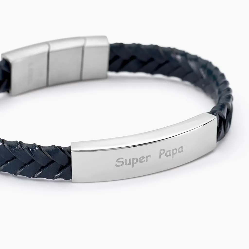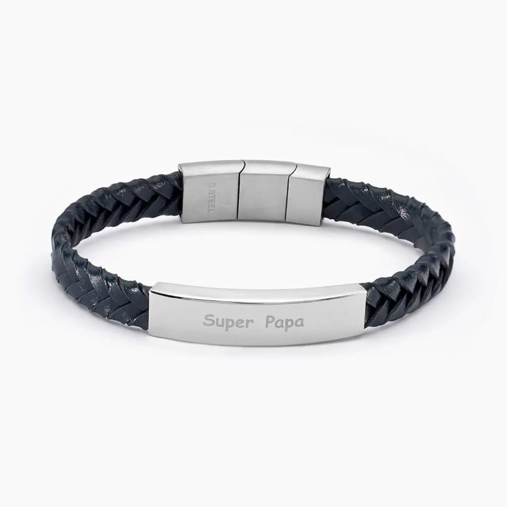 Bracelet Acier Inoxydable Blanc Cuir De Vache Tressé Bleu Plaque Message Super Papa 21cm