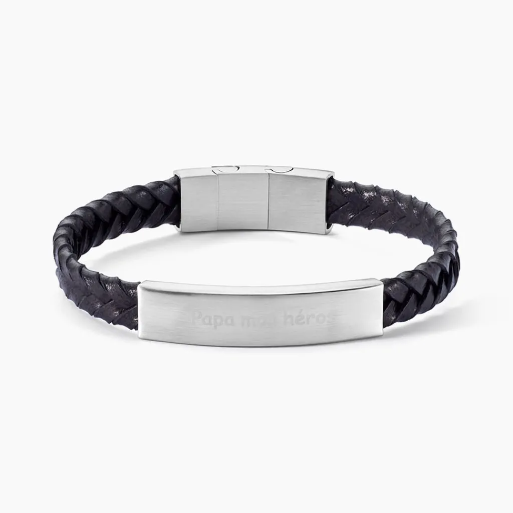 Bracelet Acier Inoxydable Blanc Cuir De Vache Noir Tressé Plaque Message Papa Mon Heros 21cm