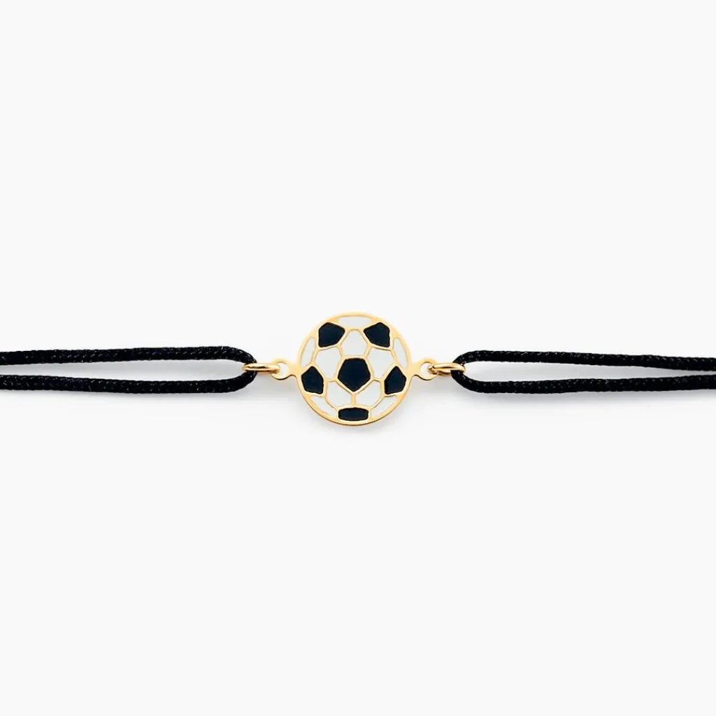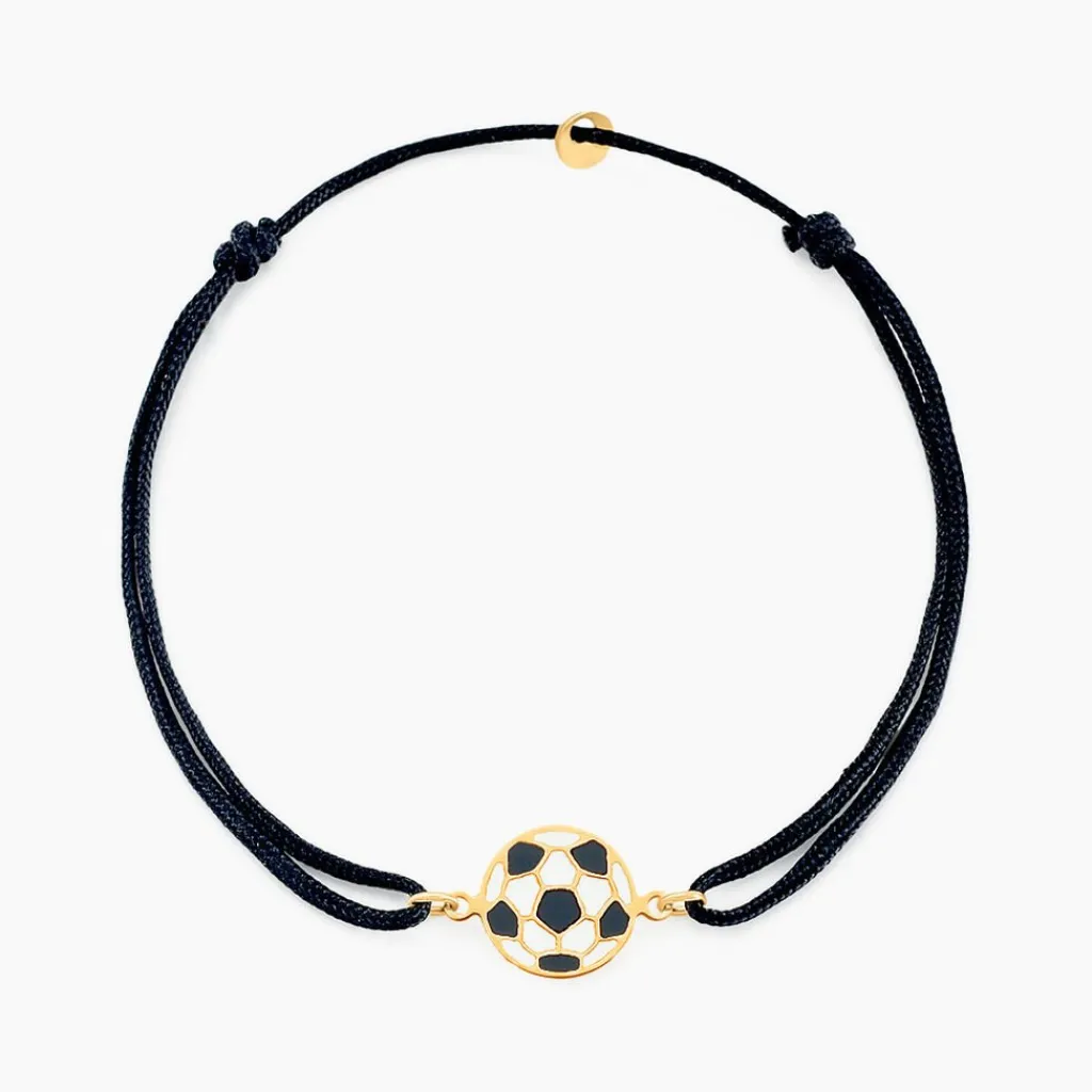 Bracelet Or Jaune 375/1000 Ballon De Foot Sur Cordon Ajustable Nylon Noir